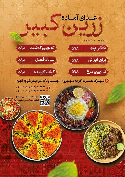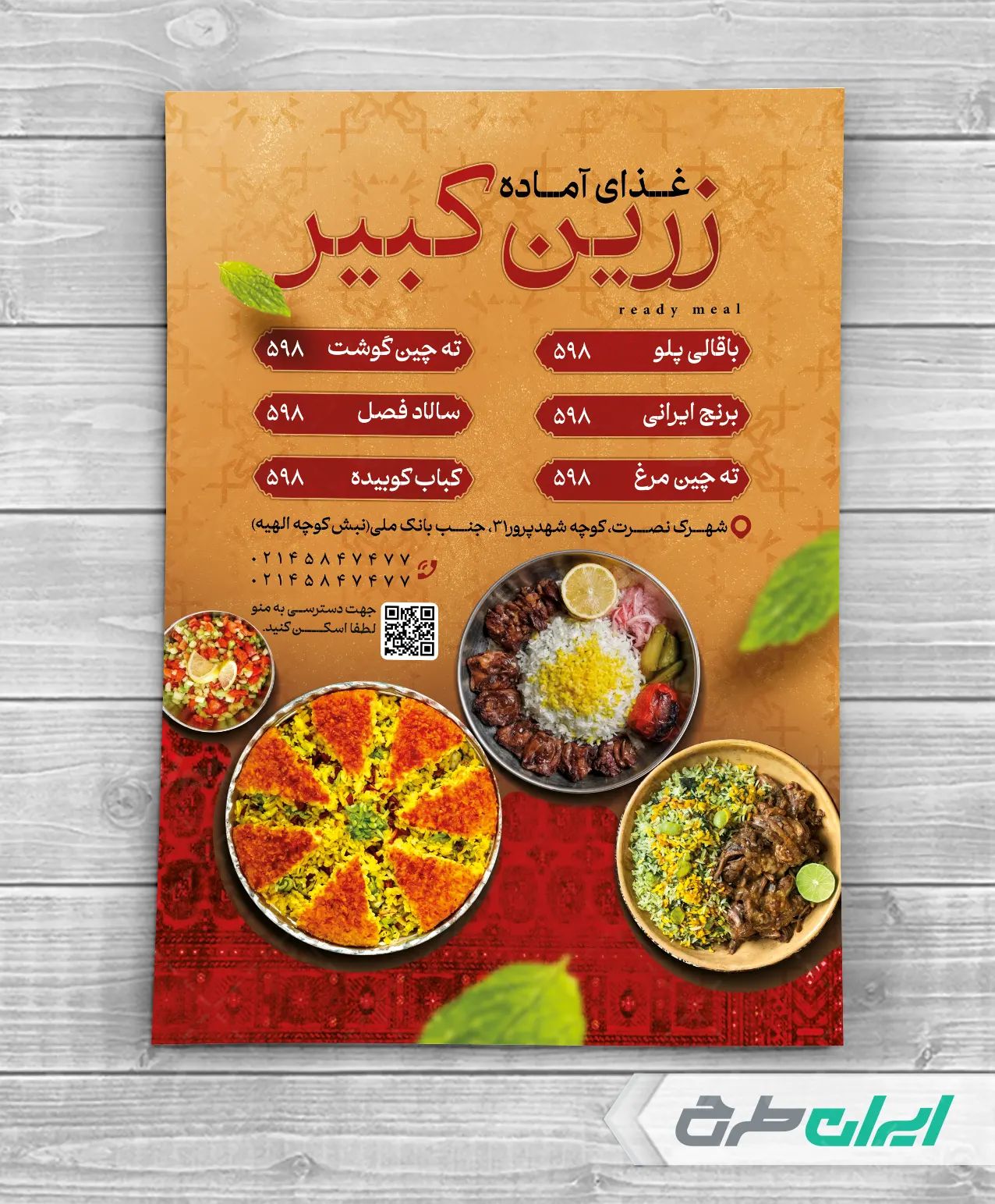 - استفاده از عکس باکیفیت غذای ایرانی که مناسب طرح تراکت رستوران می باشد.