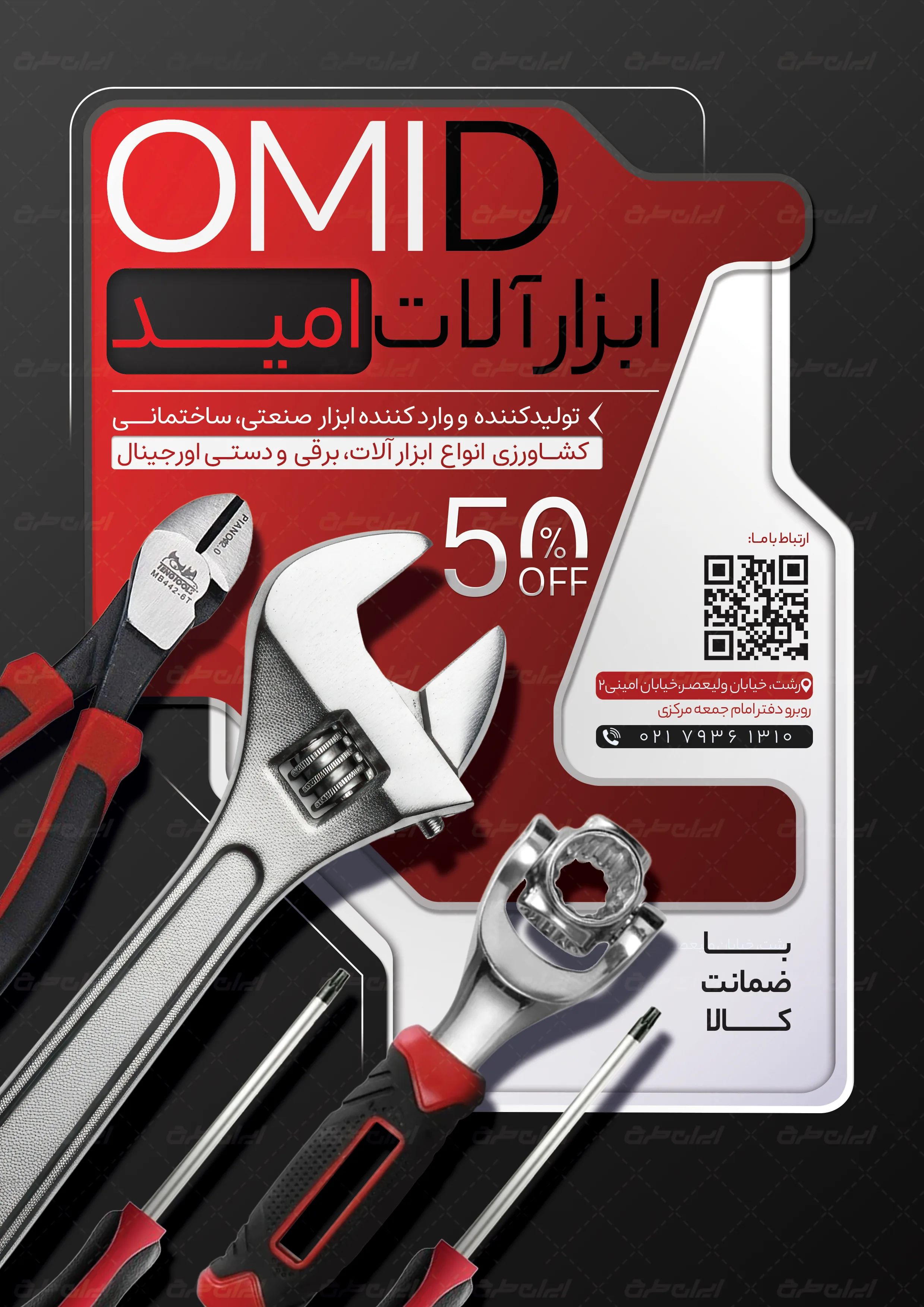 - استفاده از عکس باکیفیت ابزار یراق که مناسب با طرح تراکت لایه باز ابزار فروشی