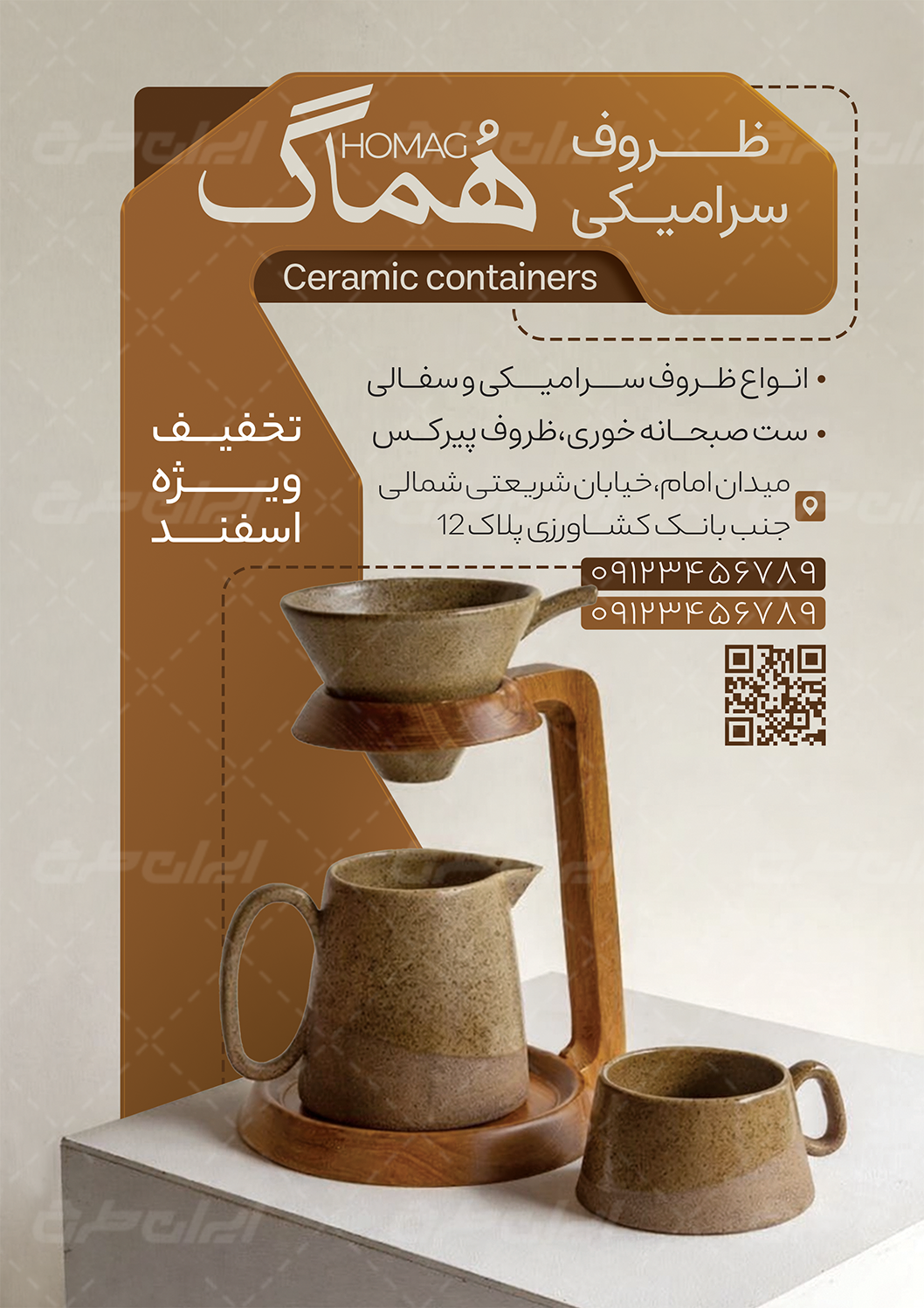 طرح تراکت فروشگاه ظروف سرامیکی، جهت بازاریابی و تبلیغات این دسته از فروشگاه ها توسط تیم طراحان ایران طرح طراحی و در دسترس کاربران سایت قرار گرفته است.