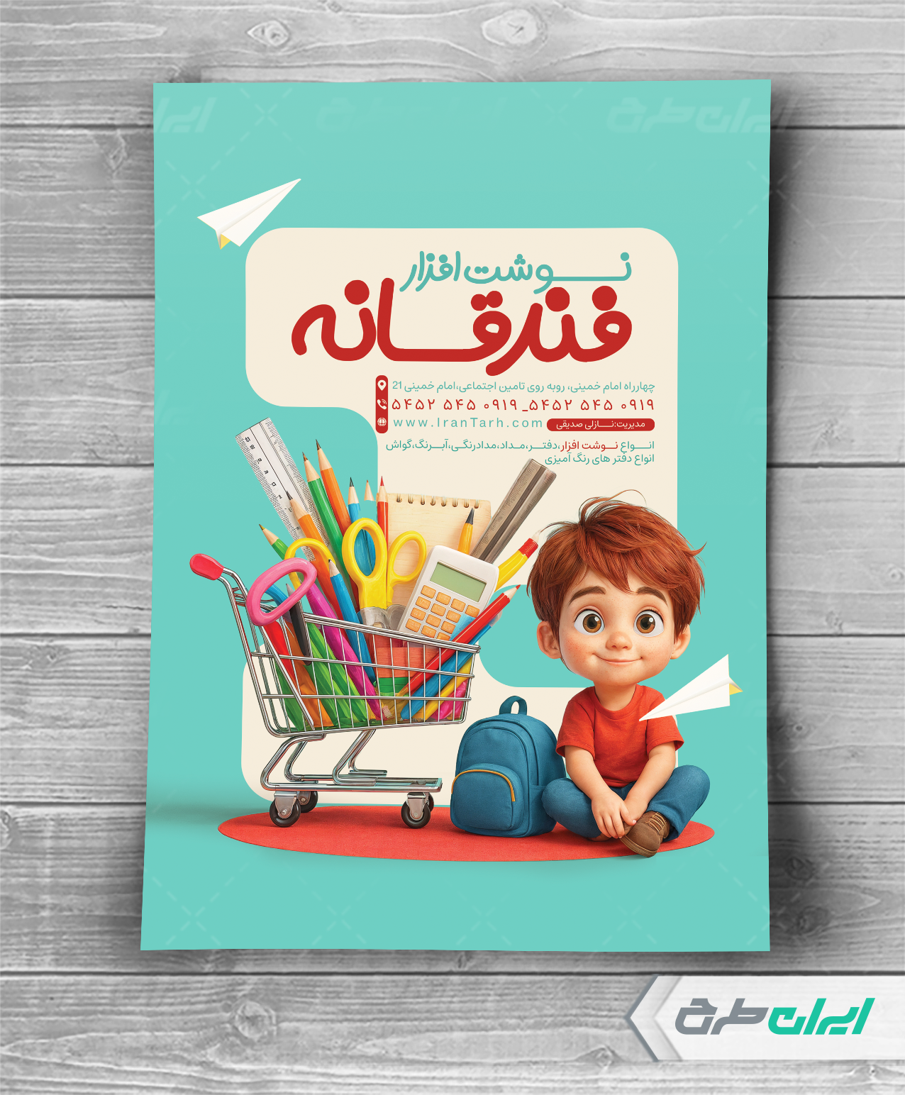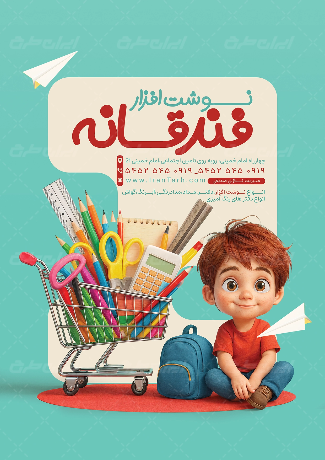طرح تراکت لایه باز فروشگاه نوشت افزار، جهت بازاریابی و تبلیغات این دسته از فروشگاه ها توسط تیم طراحان ایران طرح طراحی و در دسترس کاربران سایت قرار گرفته است.