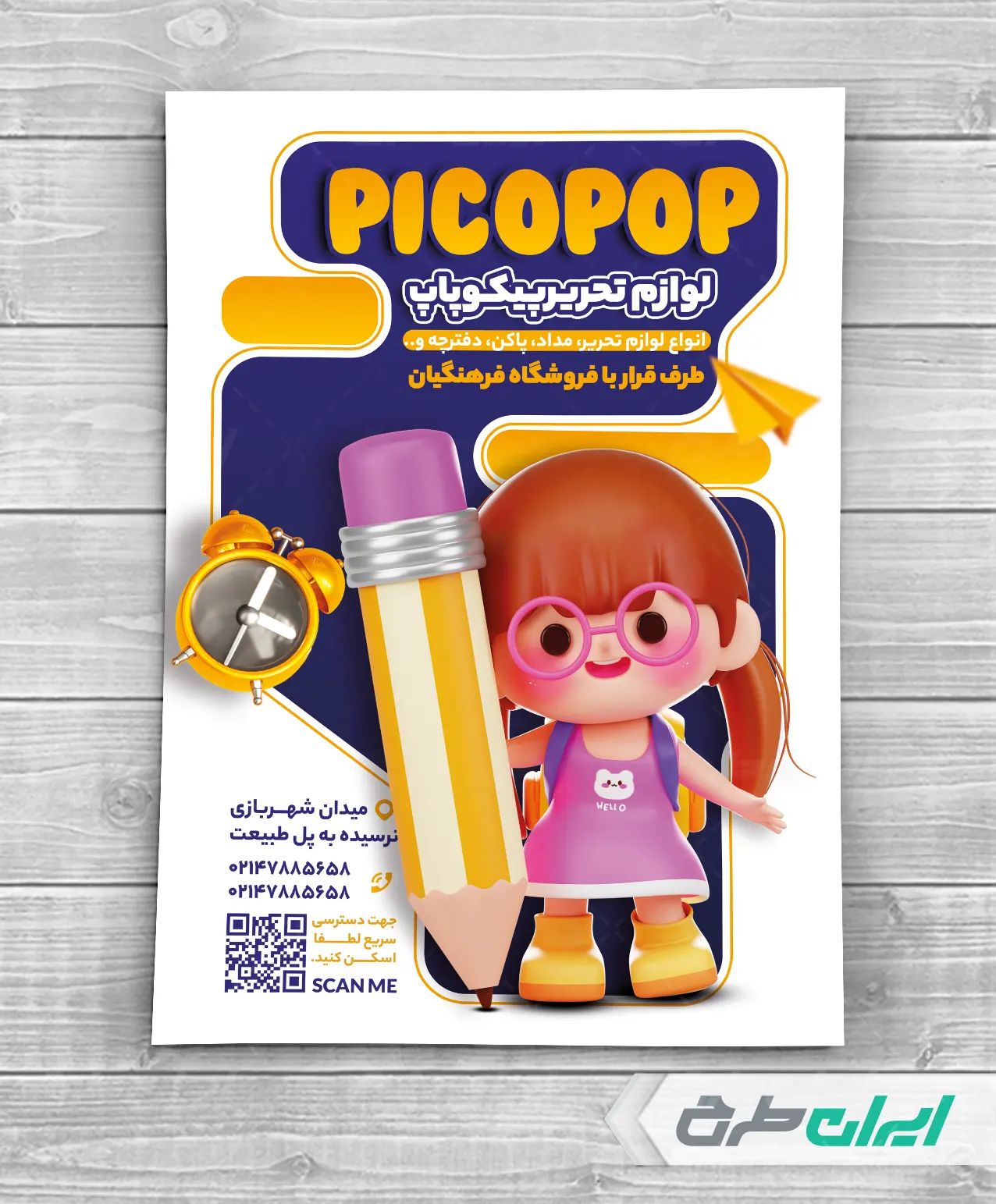 طرح تراکت لایه باز فروشگاه نوشت افزار، جهت بازاریابی و تبلیغات این دسته از فروشگاه ها توسط تیم طراحان ایران طرح طراحی و در دسترس کاربران سایت قرار گرفته است.