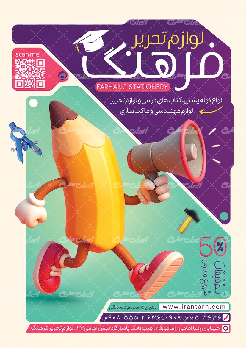 طرح تراکت لایه باز فروشگاه نوشت افزار، جهت بازاریابی و تبلیغات این دسته از فروشگاه ها توسط تیم طراحان ایران طرح طراحی و در دسترس کاربران سایت قرار گرفته است.