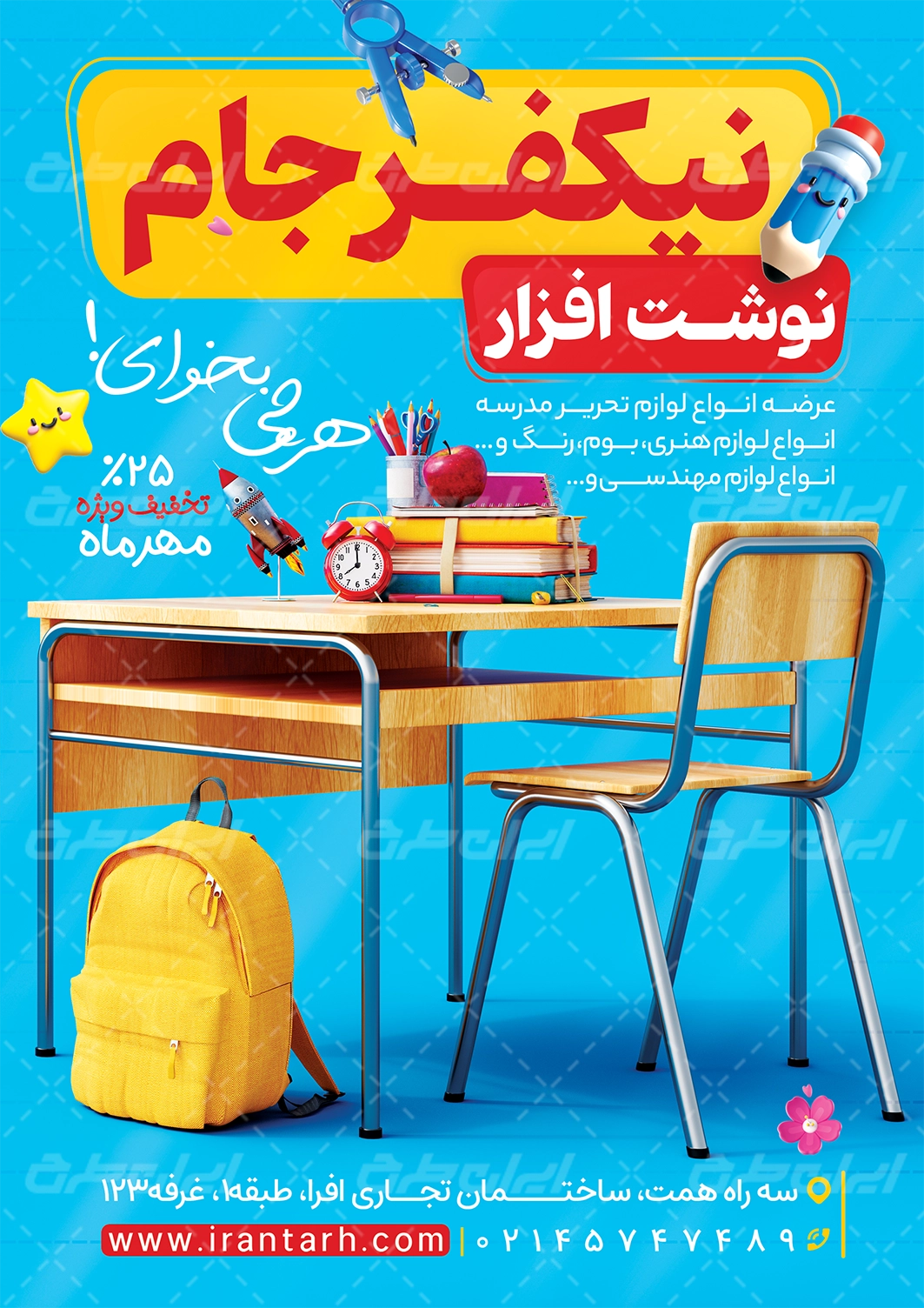 طرح تراکت لایه باز فروشگاه نوشت افزار، جهت بازاریابی و تبلیغات این دسته از فروشگاه ها توسط تیم طراحان ایران طرح طراحی و در دسترس کاربران سایت قرار گرفته است.