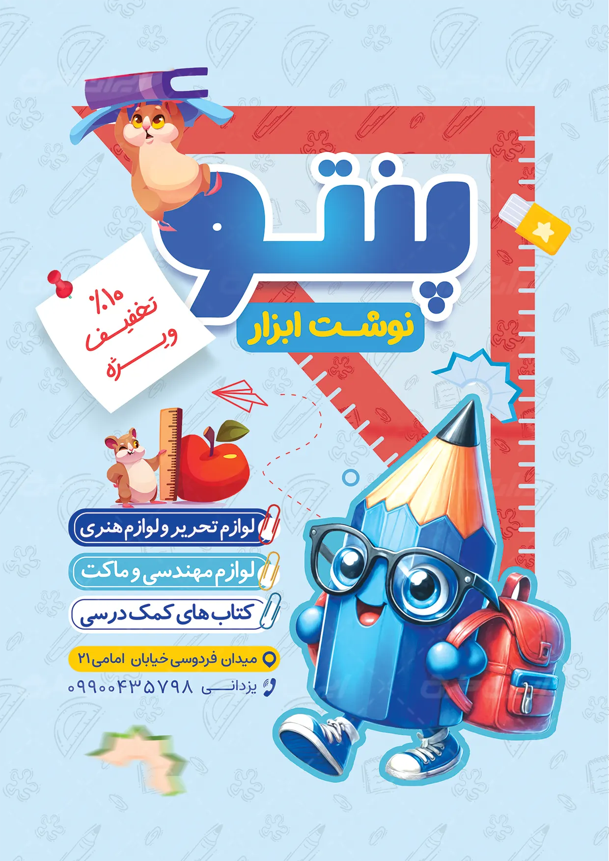 طرح تراکت لایه باز فروشگاه نوشت افزار، جهت بازاریابی و تبلیغات این دسته از فروشگاه ها توسط تیم طراحان ایران طرح طراحی و در دسترس کاربران سایت قرار گرفته است.