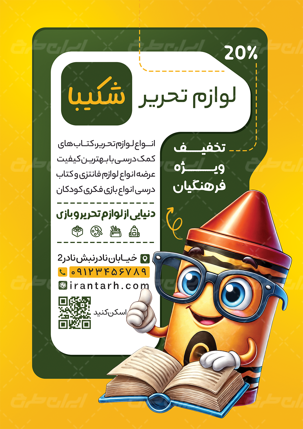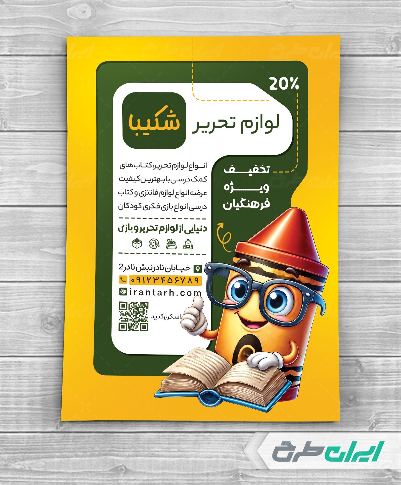 طرح تراکت لایه باز فروشگاه نوشت افزار، جهت بازاریابی و تبلیغات این دسته از فروشگاه ها توسط تیم طراحان ایران طرح طراحی و در دسترس کاربران سایت قرار گرفته است.