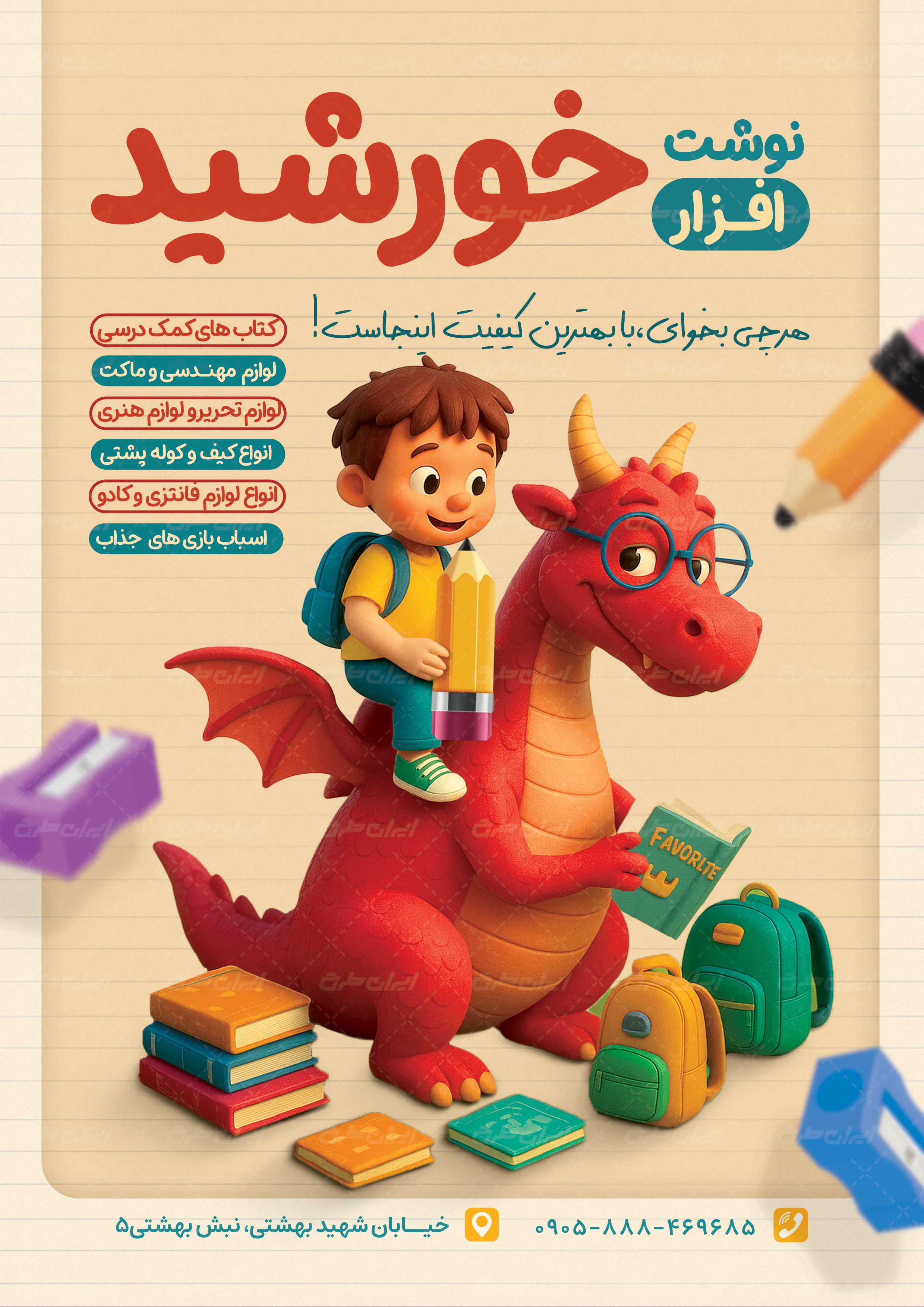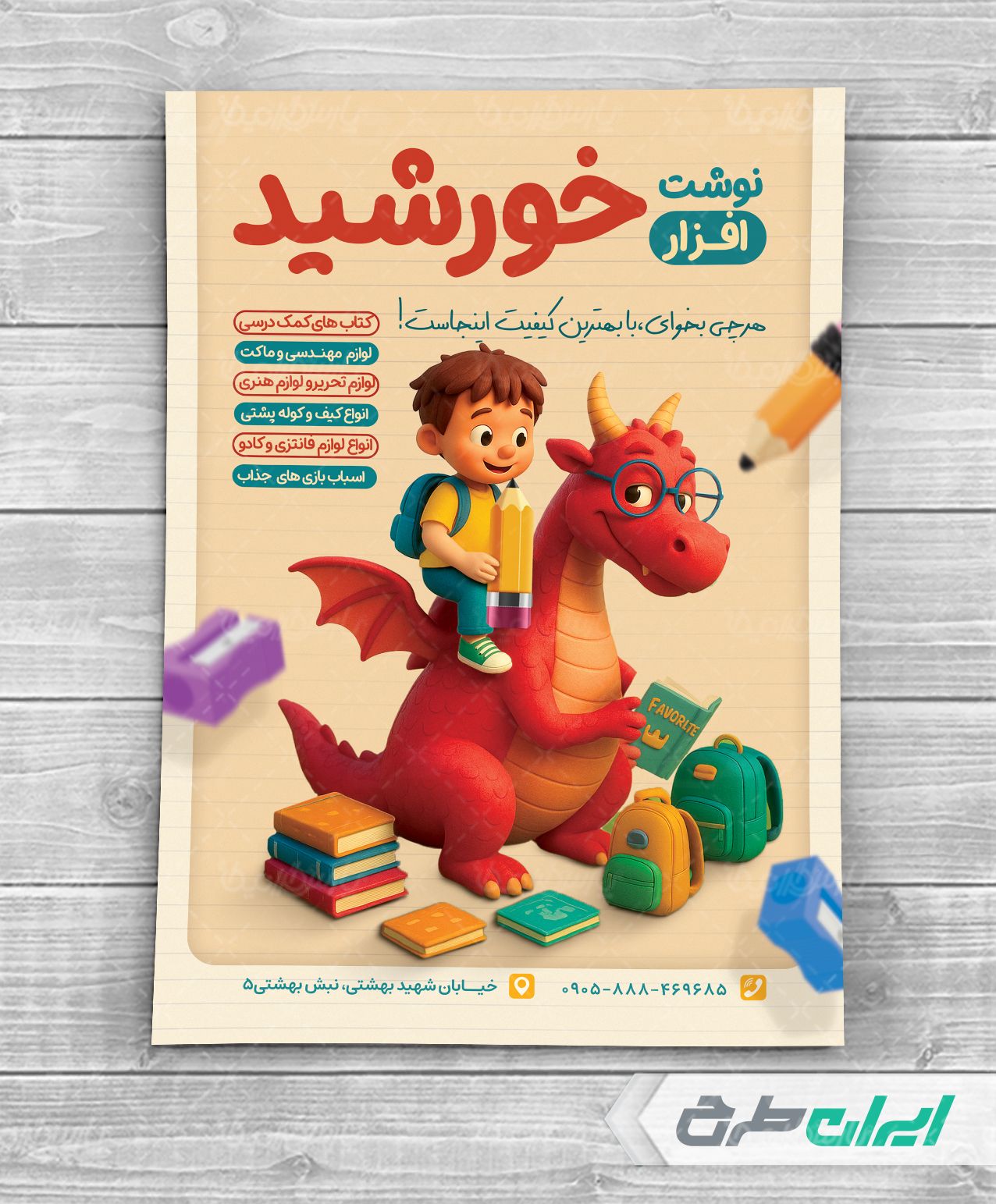 طرح تراکت لایه باز فروشگاه نوشت افزار، جهت بازاریابی و تبلیغات این دسته از فروشگاه ها توسط تیم طراحان ایران طرح طراحی و در دسترس کاربران سایت قرار گرفته است.