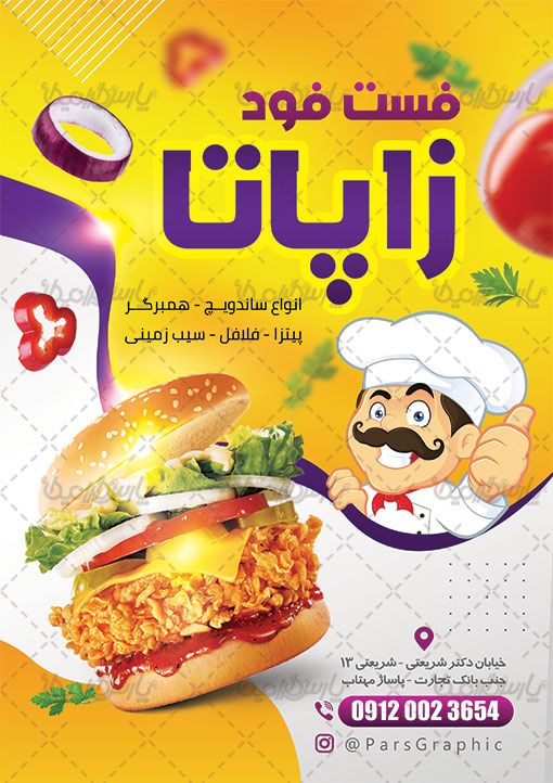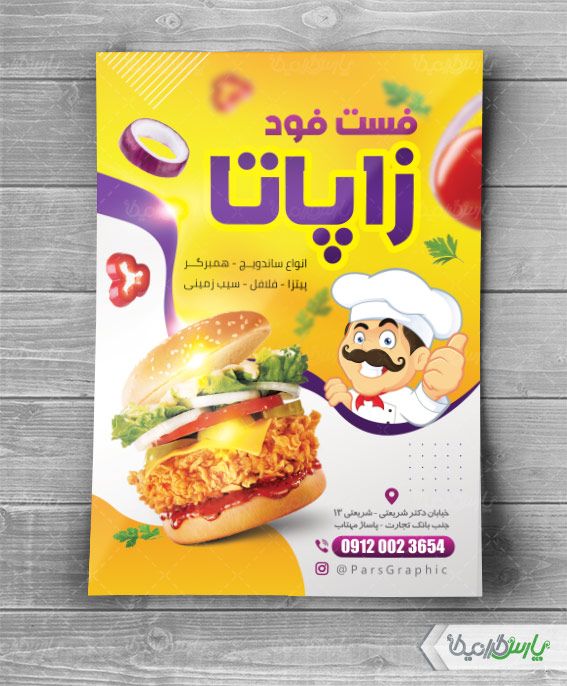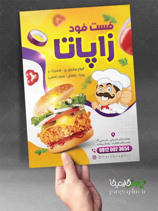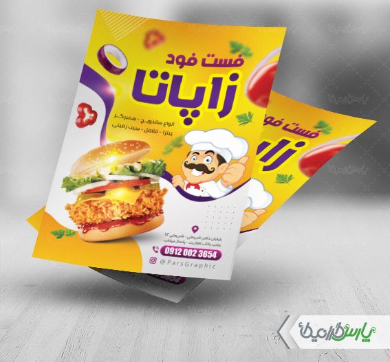 طرح تراکت فست فود بصورت عمودی طراحی شده است.