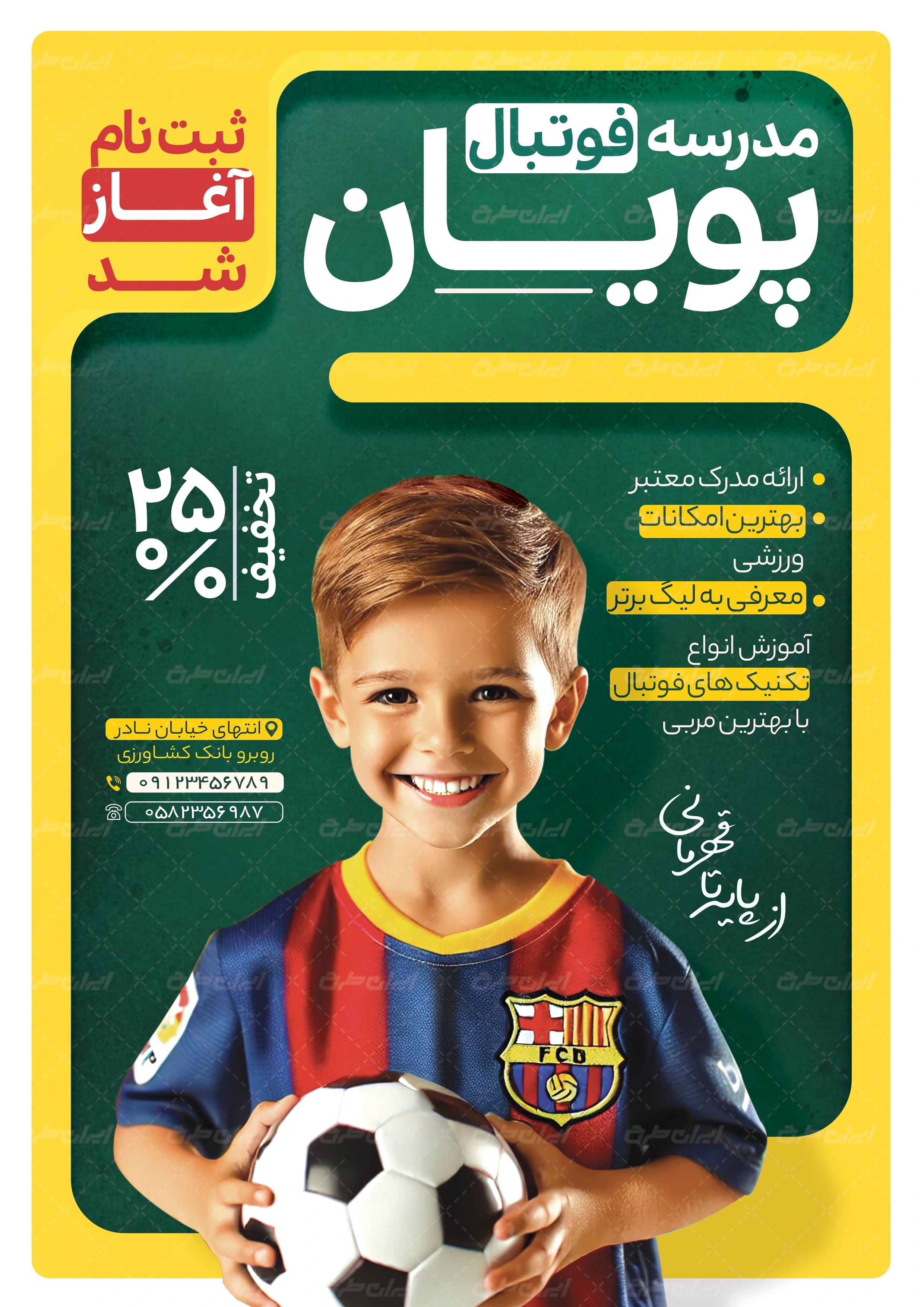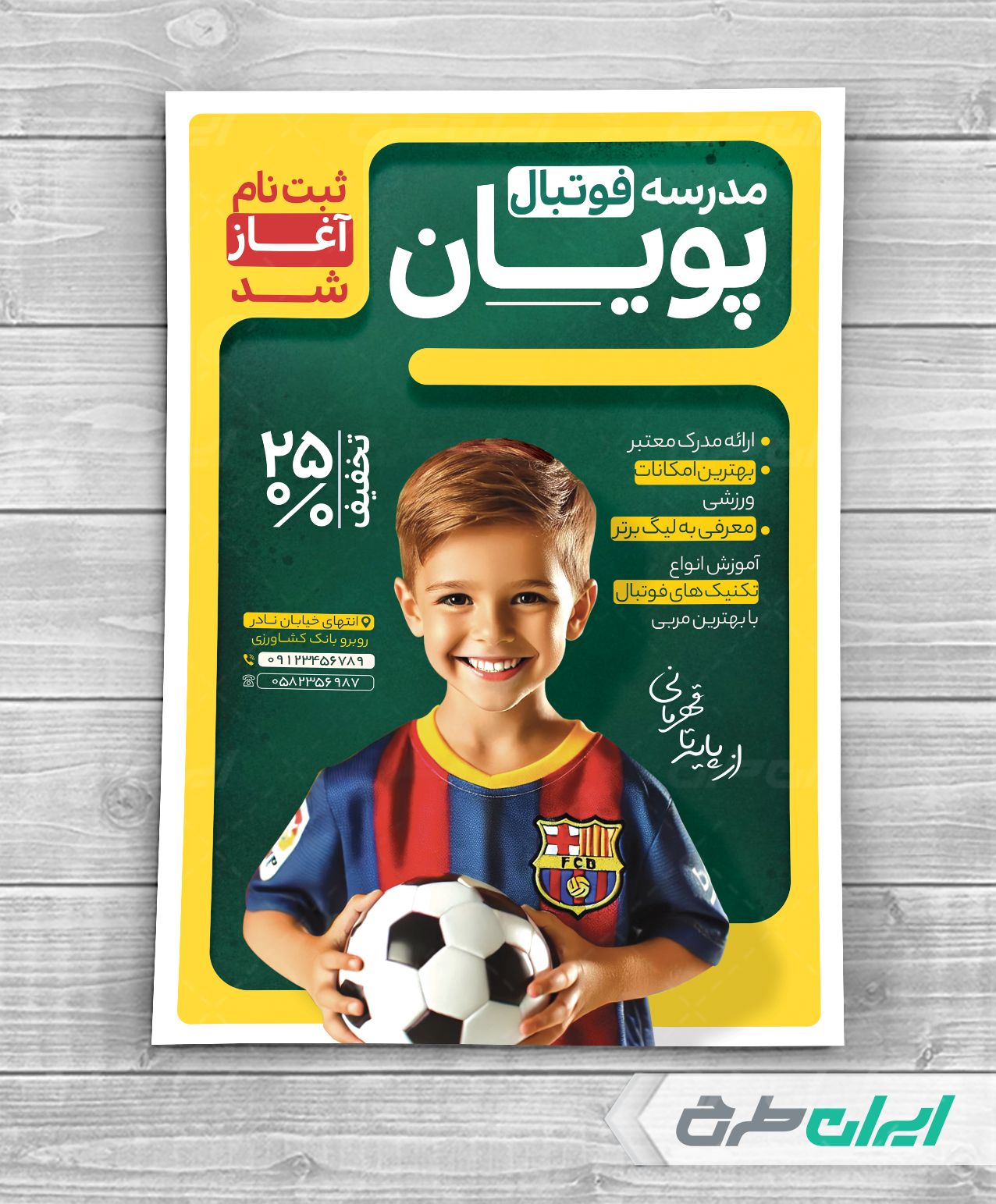 طرح تراکت لایه باز مدرسه فوتبال، جهت بازاریابی و تبلیغات این کلاس ها توسط ایران طرح طراحی و در اختیار کاربران سایت قرار گرفته است.