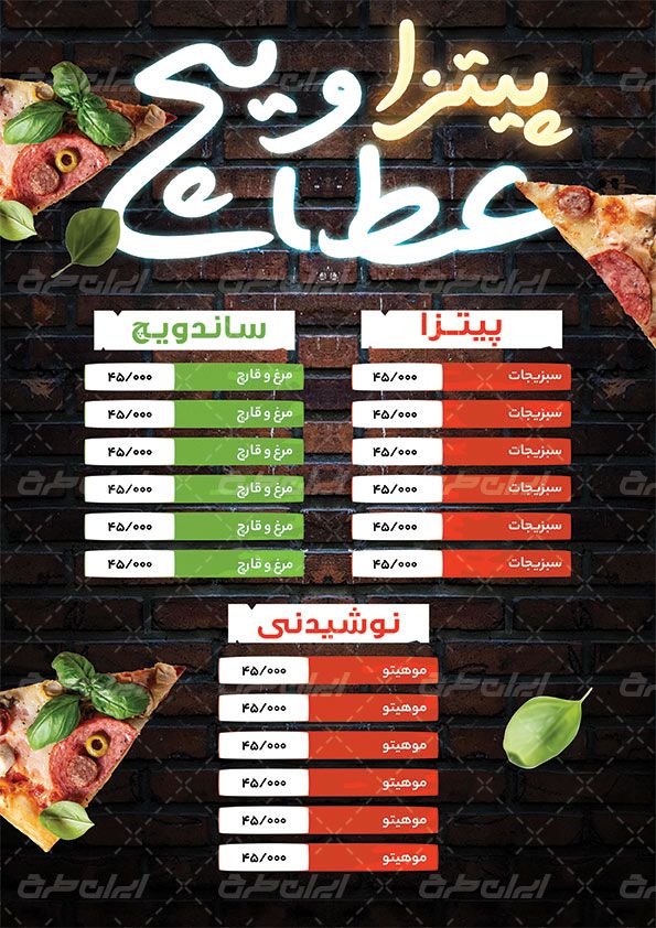 طرح تراکت فست فود شامل: عکس با کیفیت پیتزا ،لیست غذاها و قسمت ، تصویر مرتبط با طرح فست فود، فست فود، لیبل و شیپ های کاربردی می باشد که توسط طراحان ایران طرح در نرم افزار فتوشاپ طراحی شده است. به دلیل لایه باز بودن (قابل ویرایش توسط کاربران در نرم افزار فتوشاپ Adobe Photoshop) بودن و کیفیت بالای عناصر و المان های استفاده شده در طرح تراکت رنگی ، می توانید از این طرح علاوه بر چاپ تراکت(به صورت عمودی)، از سایر موارد تبلیغاتی از جمله نصب روی بیلبورد، استوری اینستاگرام و دیگر پلت فرم های فضای مجازی بهره ببرید.