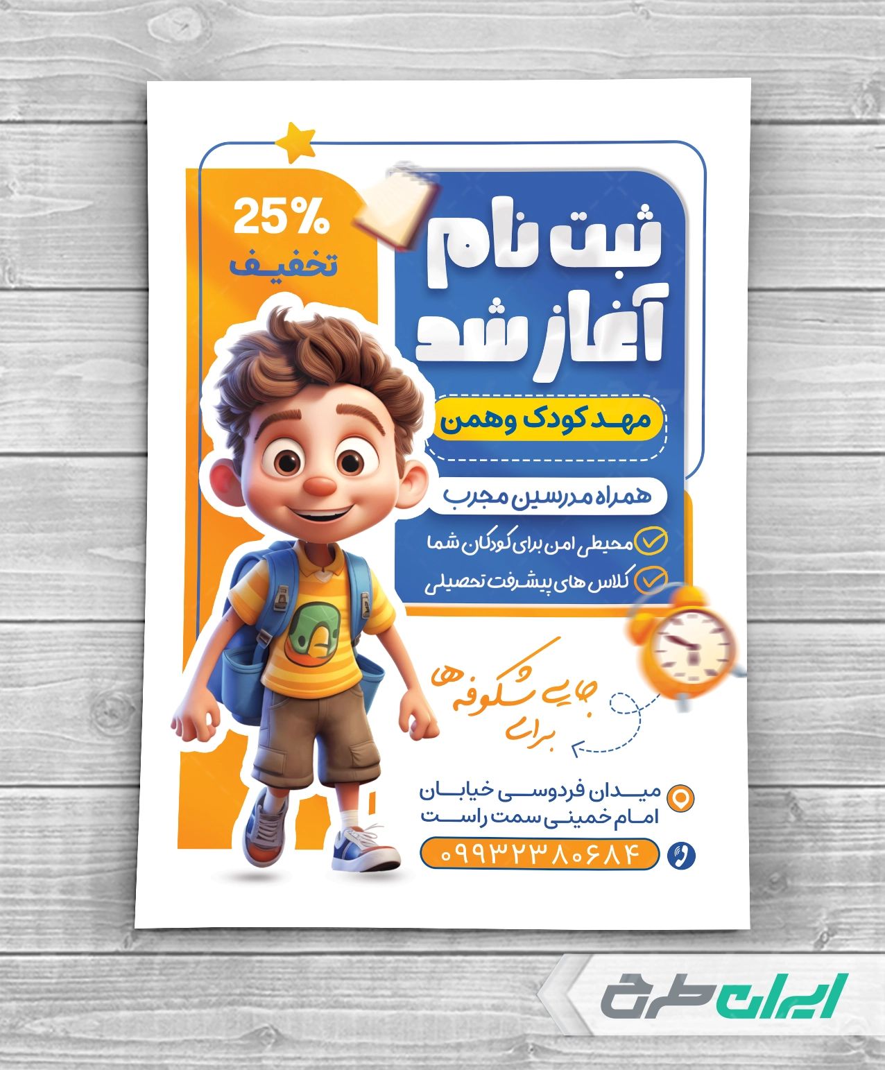 طرح تراکت لایه باز مهدکودک و پیش دبستانی جهت تبلیغات و بازاریابی این دسته از مشاغل توسط تیم ایران طرح طراحی شده است.