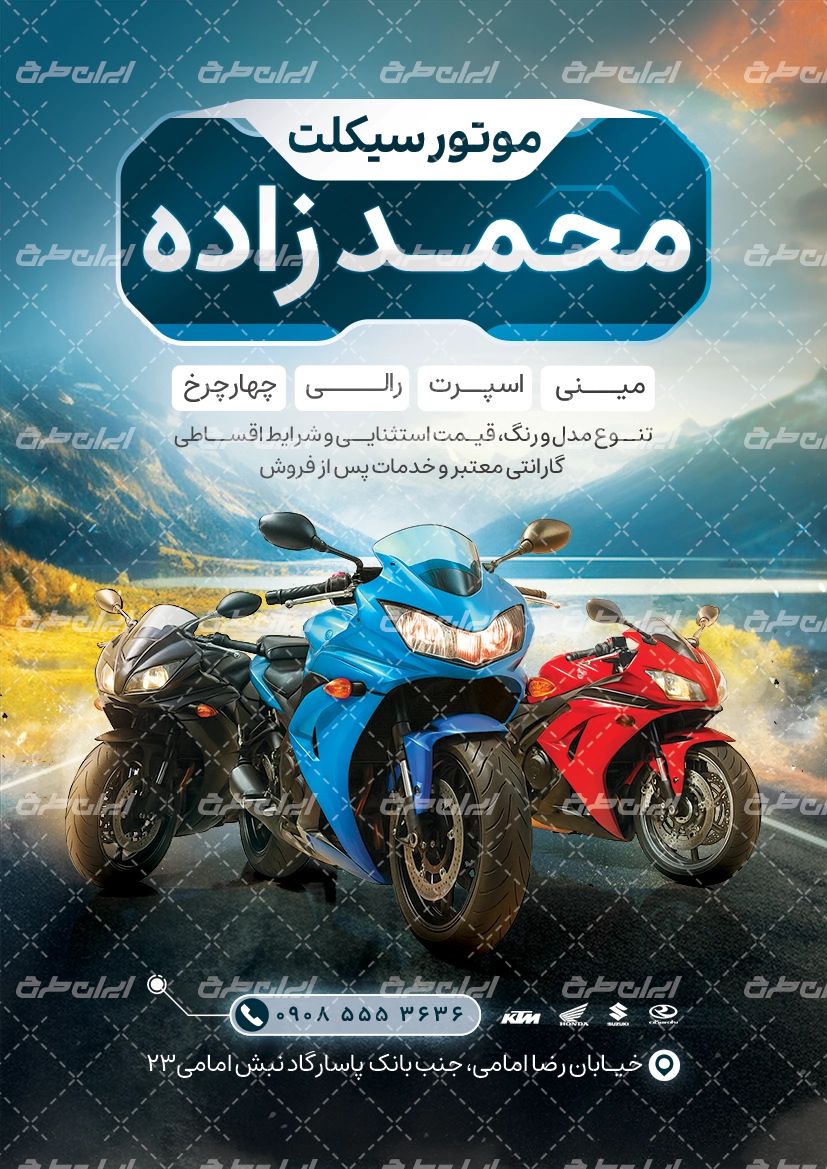 طرح لایه باز تراکت فروشگاه موتور سیکلت، توسط تیم ایران طرح جهت تبلیغات و بازاریابی این مشاغل طراحی و در دسترس کاربران سایت قرار گرفته است.