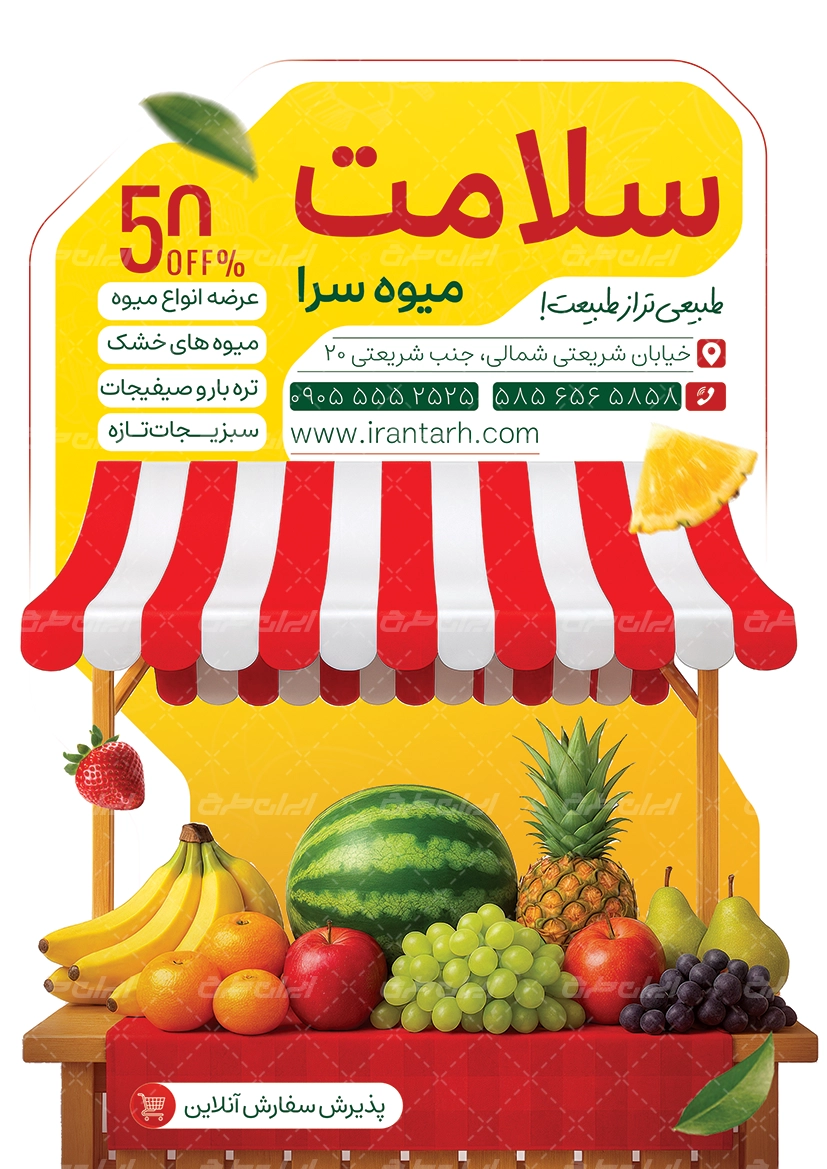 تیم ایران طرح تراکت لایه باز میوه سرا را برای بازاریابی و تبلیغات گسترده تر این فروشگاه ها طراحی و در دسترس کاربران سایت قرار داده است.