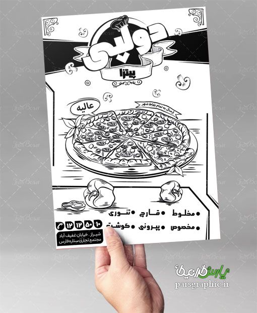 طرح تراکت تبلیغاتی پیتزا ساندویج و فست فود طراحی شده بصورت سیاه و سفید مناسب برای چاپ با دستگاه ریسو