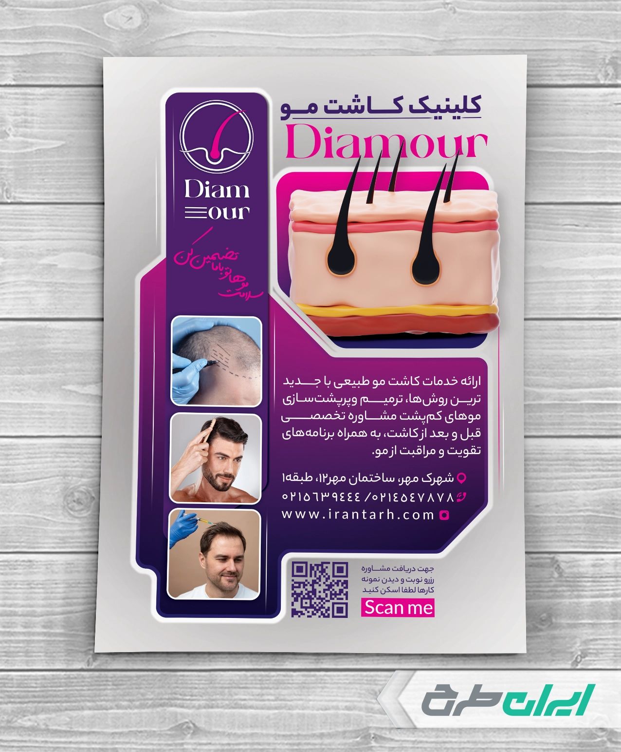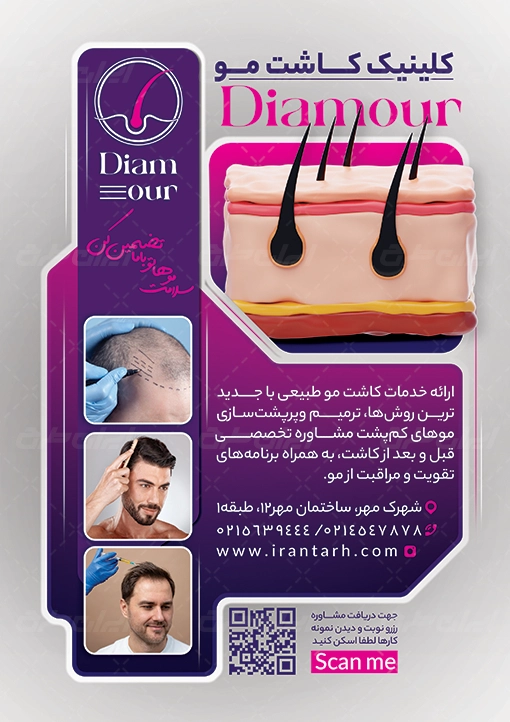 - همنشینی مناسب رنگ بنفش با طرح تراکت کلینیک کاشت مو