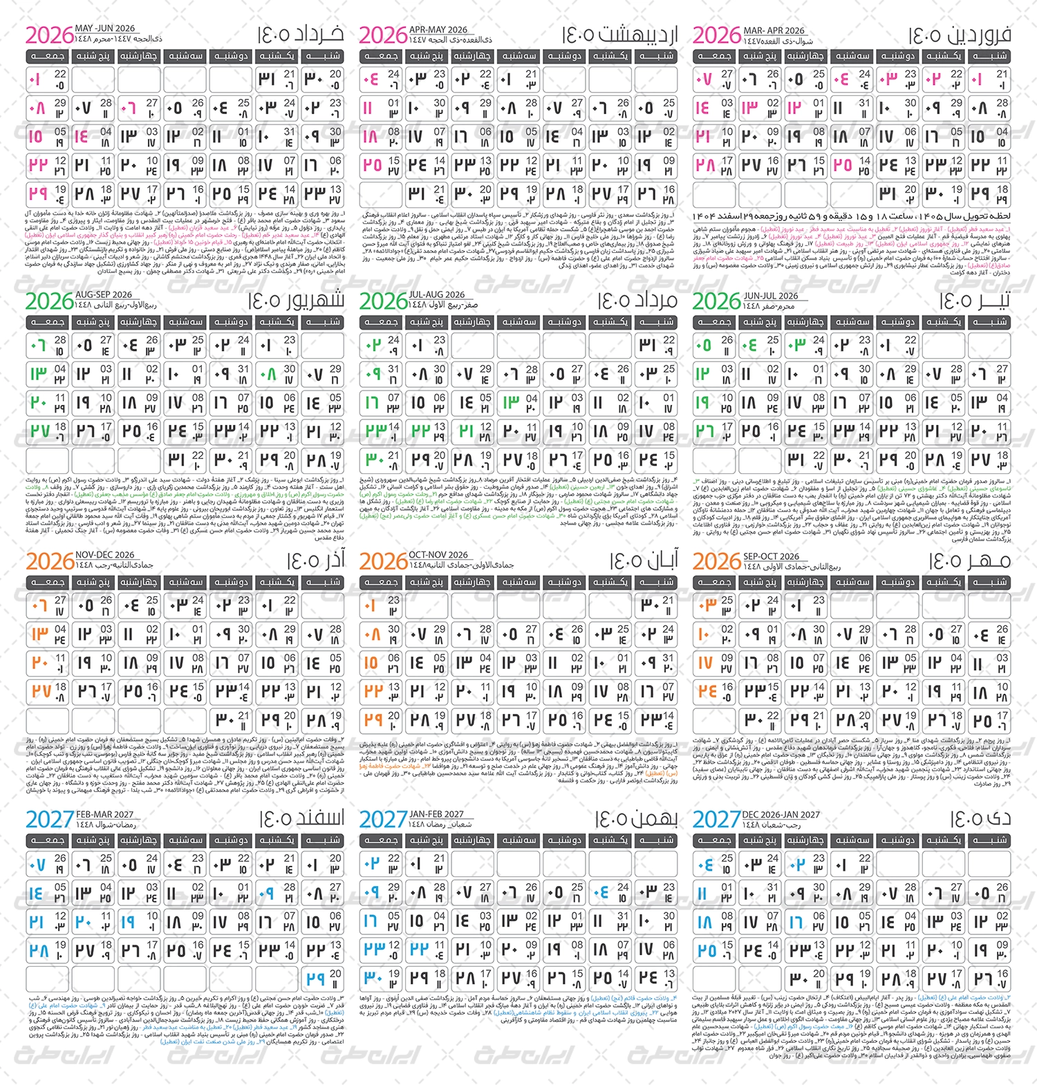 جدول بندی ماه های سال، ایام هفته، شمارش روز ها، مناسبت های شمسی و قمری، مناسبت های ملی و جهانی، لیبل ها و شیپ های کاربردی می باشد که به صورت لایه باز در نرم افزار فتوشاپ طراحی شده است.