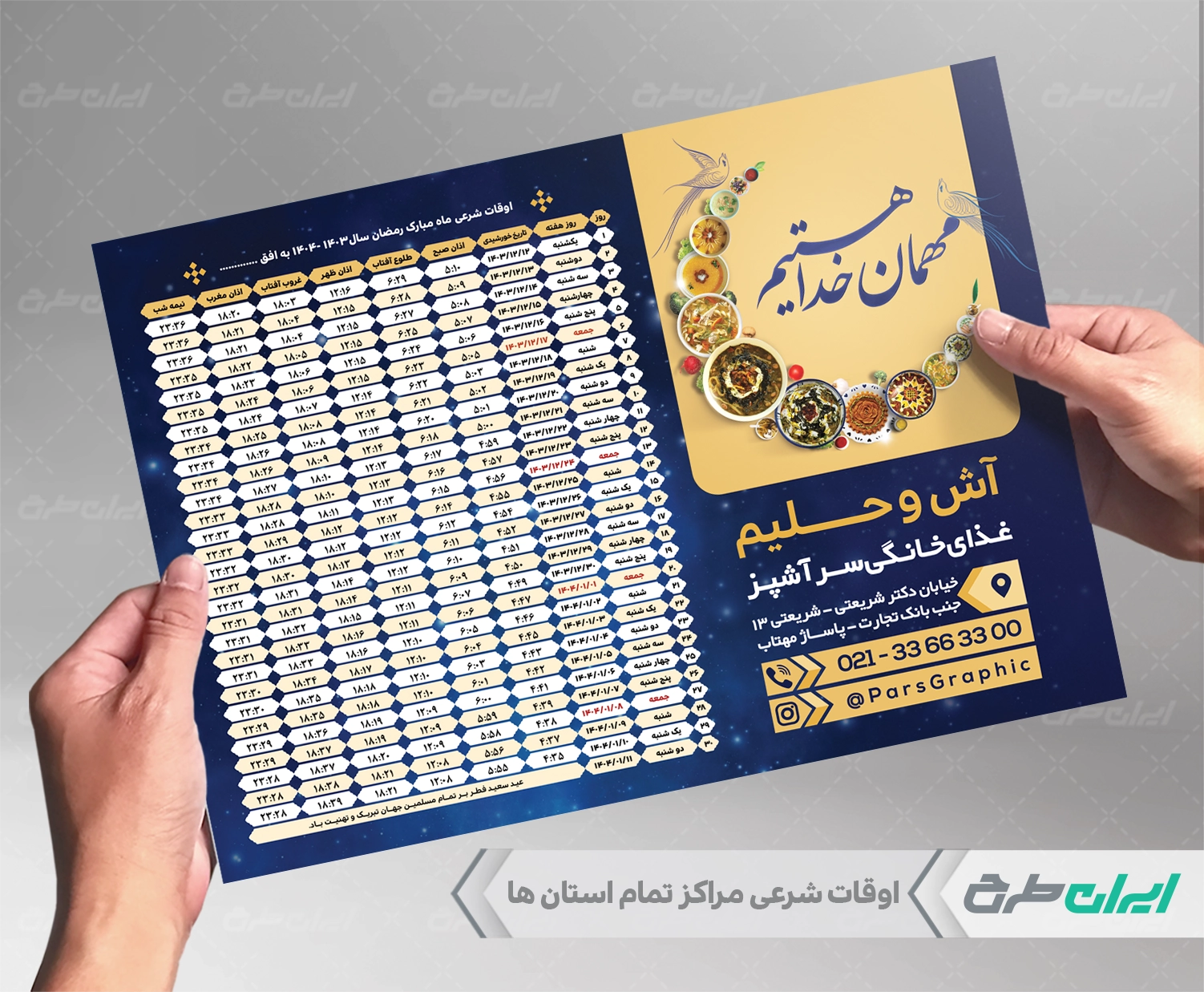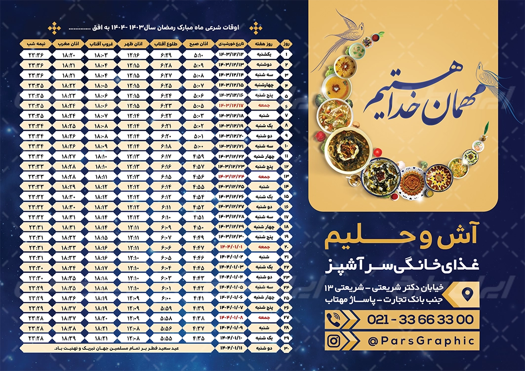 طرح اوقات شرعی ماه رمضان شامل: جدول اوقات شرعی ، جدول ماه رمضان ، تصویر کاسه آش و حلیم می باشد که توسط تیم پارس گرافیک طراحی شده است. به دلیل استفاده از عناصر و المان های با کیفیت در طرح اوقات شرعی ماه رمضان، می توانید علاوه بر چاپ (به صورت عمودی)، در استوری اینستاگرام و یا دیگر پلت فرم های فضای مجازی استفاده نمایید. ضمنا به دلیل لایه باز بود طرح اوقات شرعی ماه رمضان می توانید با استفاده از نرم افزار فتوشاپ تغییرات دلخواه خود را اعمال کنید.