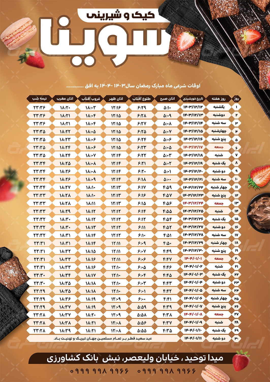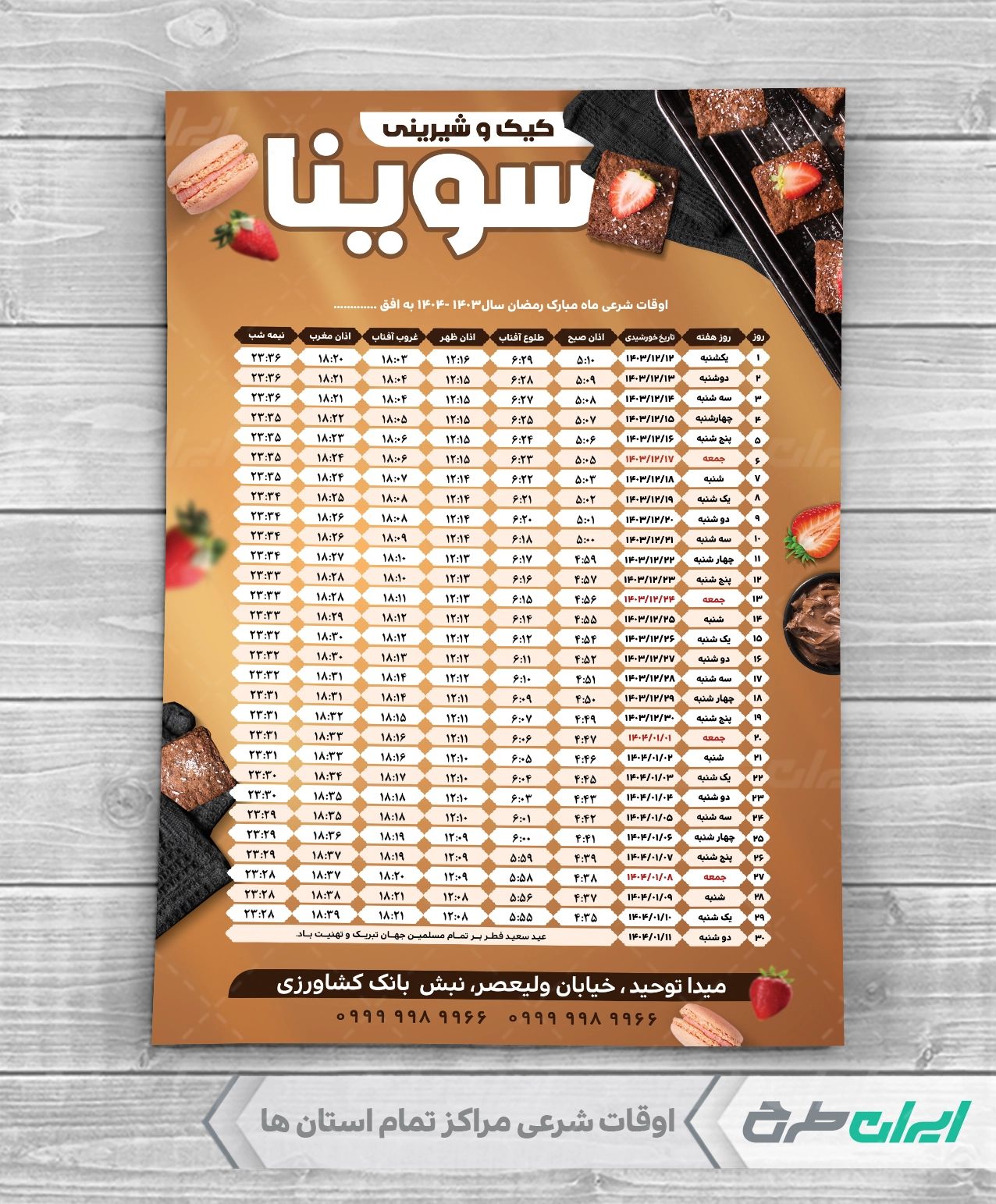 - استفاده از عکس با کیفیت کیک و شیرینی مناسب با طرح جدول اوقات شرعی قنادی