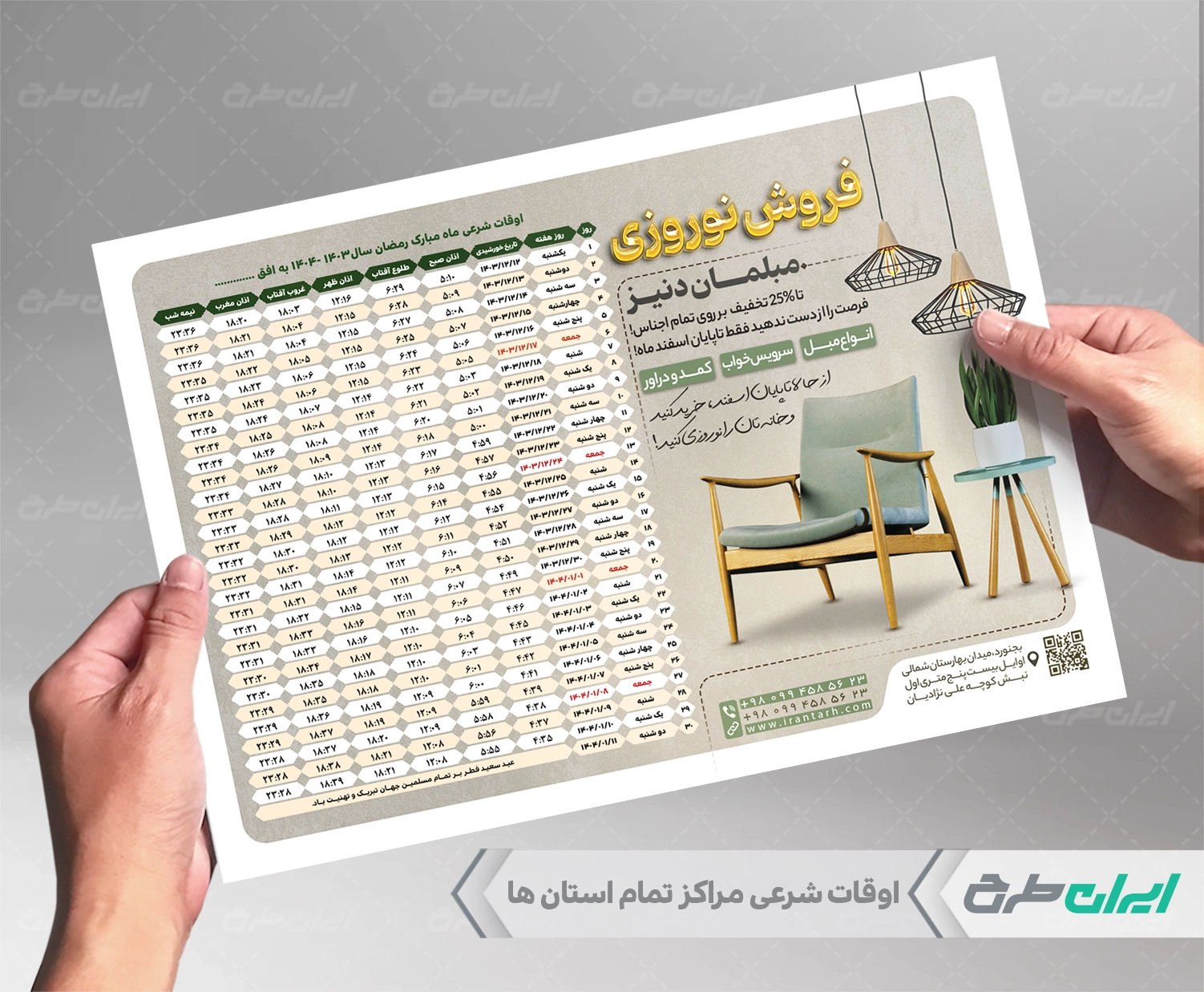 ماه رمضان فرصتی عالی برای کسبوکارهاست تا علاوه بر معرفی محصولات خود، ارتباط معنوی و فرهنگی عمیقتری با مشتریان برقرار کنند. استفاده از طرح لایه باز جدول اوقات شرعی رمضان در مبلفروشیها میتواند یک روش نوآورانه برای تبلیغات باشد. این جدولها که شامل زمانهای دقیق افطار و سحر هستند، میتوانند بهطور ویژه در فضاهای مختلف فروشگاه قرار گیرند و به مشتریان کمک کنند تا در این ماه مبارک، علاوه بر خرید مبل، از زمانهای مناسب برای افطار و سحر آگاه شوند. این اقدام میتواند فضای فروشگاه را با توجه به مناسبتهای ویژه ماه رمضان برای مشتریان دلپذیرتر و معنادارتر کند.