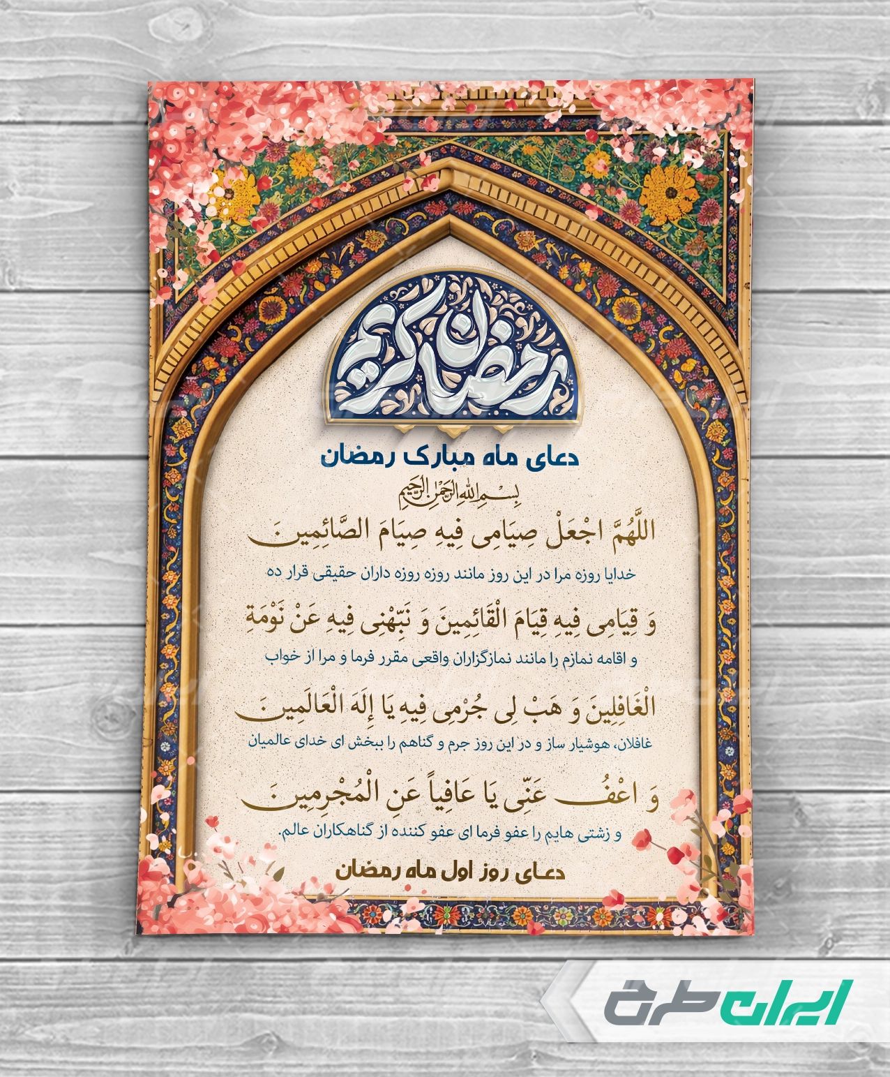 متن دعای روز اول ماه رمضان، طرح گل، تذهیب، نقوش مذهبی می باشد که توسط تیم ایران طرح طراحی شده است.