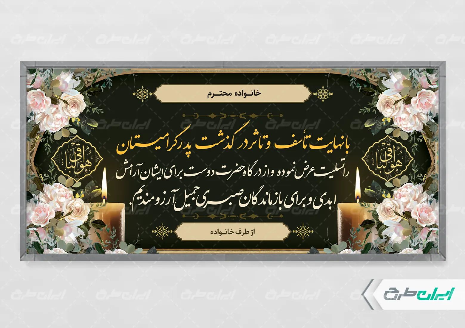 طرح بنر تسلیت ، توسط تیم حرفه ای ایران طرح جهت استفاده کاربران سایت طراحی و به صورت لایه باز در دسترس کاربران قرار گرفته است.