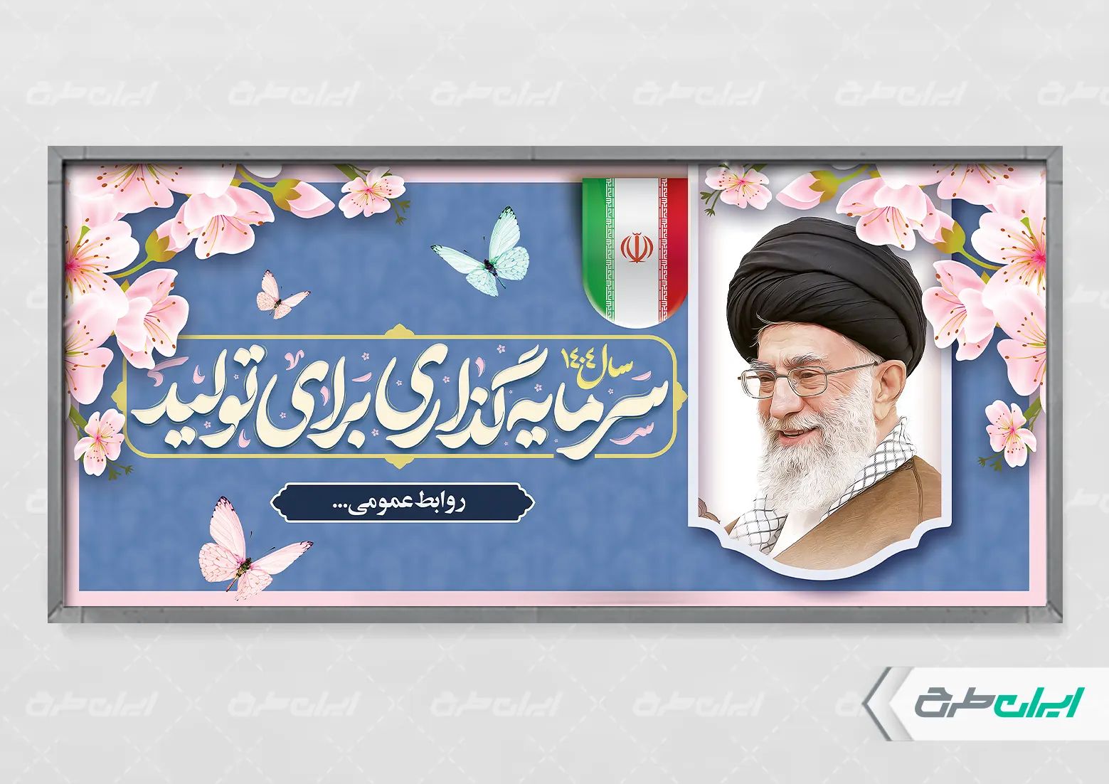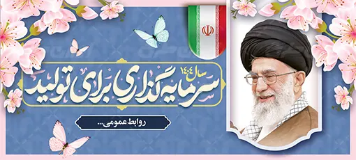 تصویر رهبری و متن شعار سال سرمایه گذاری برای تولید، که توسط تیم ایران طرح طراحی شده است.