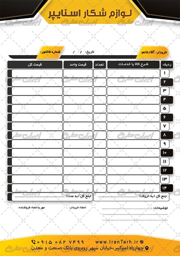 طرح لایه باز ست اداری فروشگاه لوازم شکار میتواند به عنوان یک ابزار مؤثر در تبلیغات و جذب مشتریان در این صنعت عمل کند. ست اداری شامل انواع لوازم و تجهیزات مورد نیاز برای فعالیتهای شکاری است و با طراحی زیبا و مناسب میتواند به تبلیغات و بازاریابی موثری تبدیل شود.