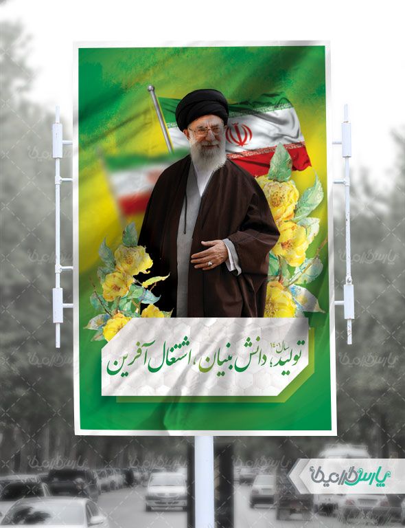 - طراحی بنر با استفاده از تصویر ایت الله خامنه ای در طرح بنر شعار سال