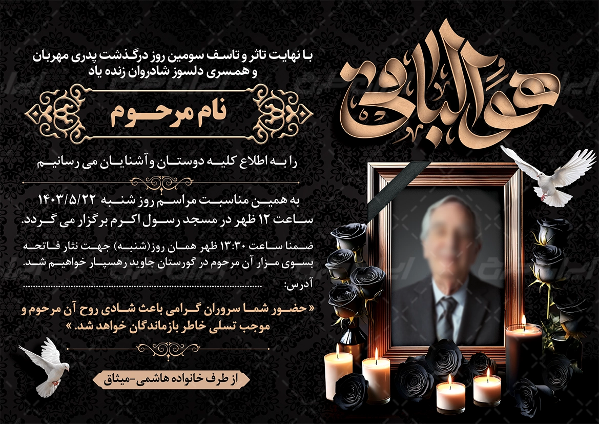 طرح لایه باز آگهی ترحیم یکی از مهمترین ابزارها برای اطلاعرسانی در مراسمهای عزاداری و سوگواری است. این نوع آگهیها معمولاً شامل اطلاعاتی مانند تاریخ، زمان و مکان مراسم ترحیم، وصیتنامه یا اشعار تسلیتی هستند که بهطور خاص برای هر فرد یا خانواده طراحی میشود. طرحهای لایه باز این آگهیها این امکان را به طراحان میدهند که بهراحتی آنها را شخصیسازی کرده و با افزودن عکس متوفی، رنگها و فونتهای خاص، آگهیای منحصر به فرد بسازند که احساسات و احترام را بهخوبی منتقل کند.