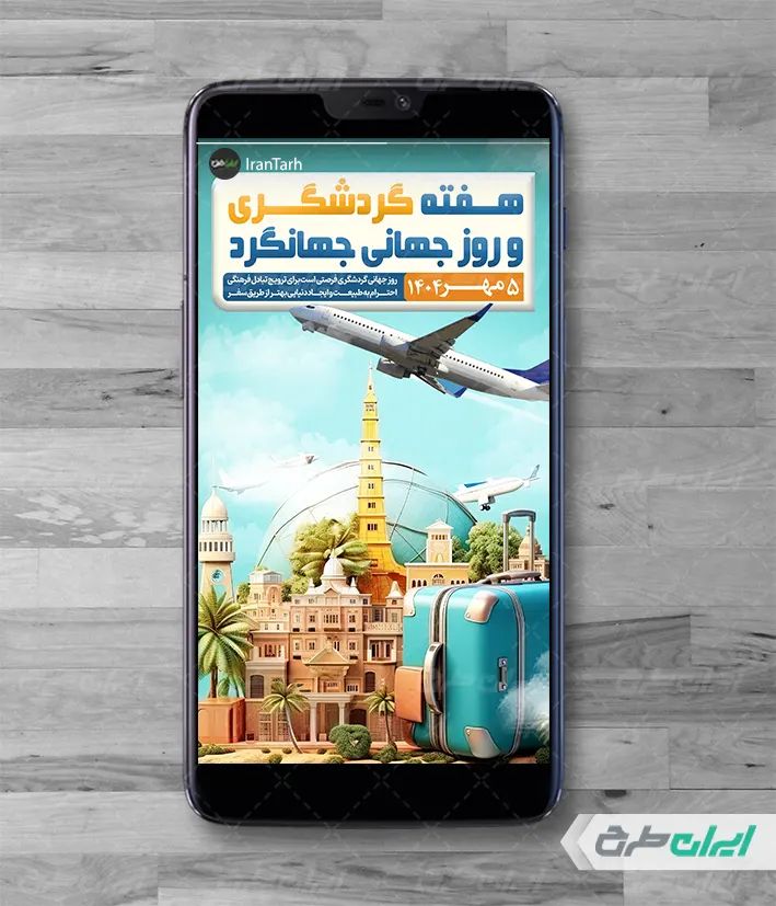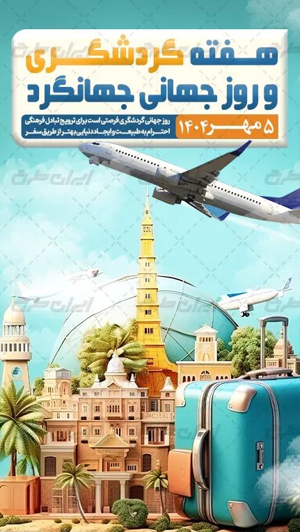 تصویر هواپیما و متن مرتبط با روز جهانگردی می باشد که توسط طراحان ایران طرح در نرم افزار فتوشاپ طراحی شده است.