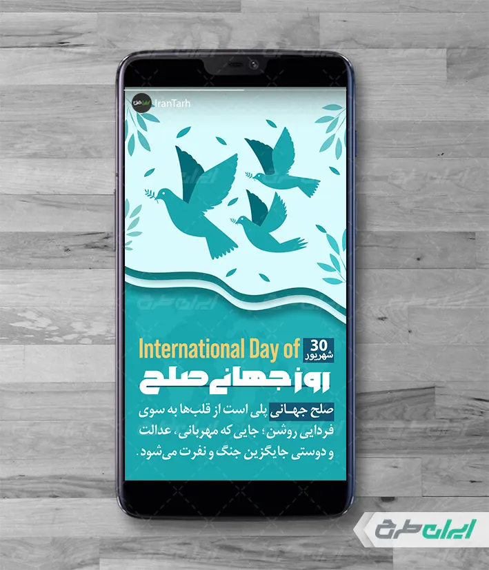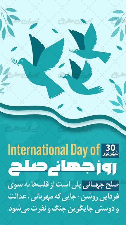 تصویر کبوتر و متن مرتبط با روز جهانی صلح می باشد که توسط طراحان ایران طرح در نرم افزار فتوشاپ طراحی شده است.