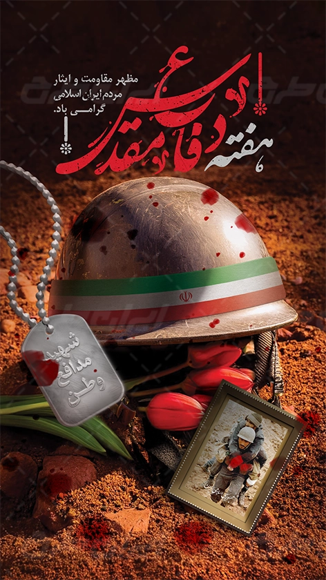 تصویر رزمنده و متن مرتبط با هفته دفاع مقدس می باشد که توسط طراحان ایران طرح در نرم افزار فتوشاپ طراحی شده است.