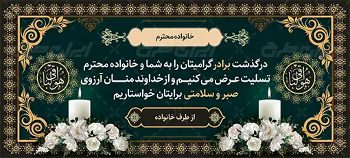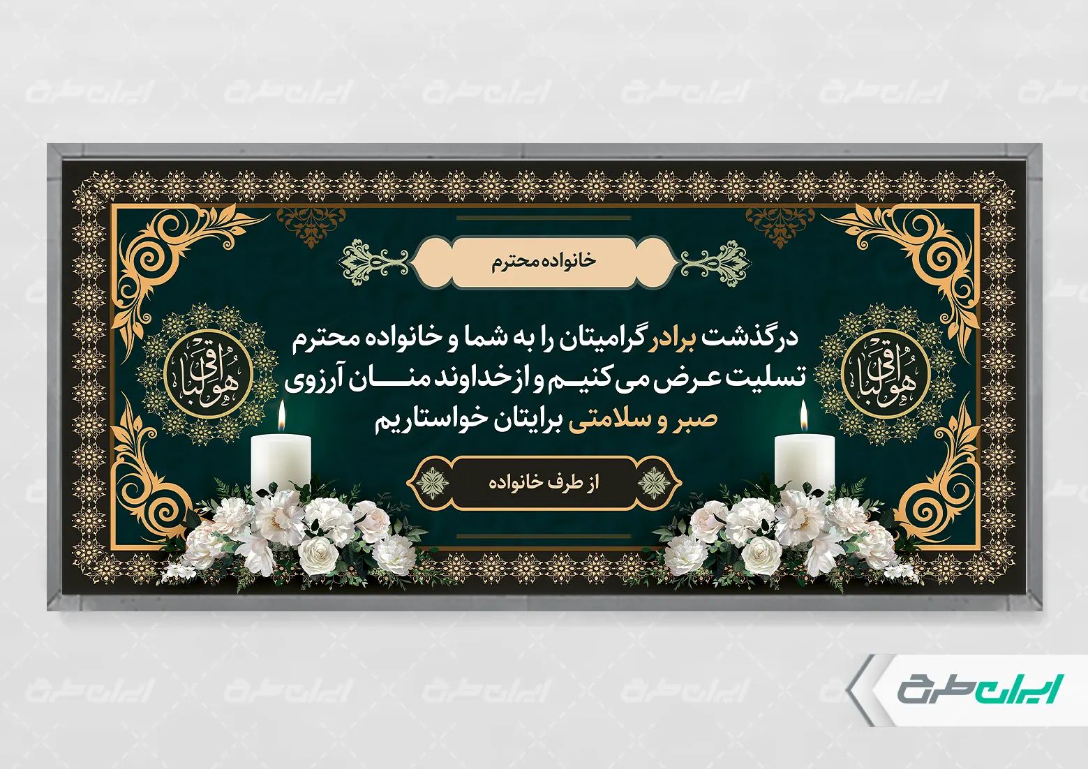 طرح بنر تسلیت ، توسط تیم حرفه ای ایران طرح جهت استفاده کاربران سایت طراحی و به صورت لایه باز در دسترس کاربران قرار گرفته است.