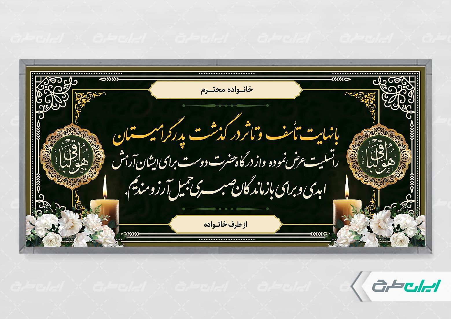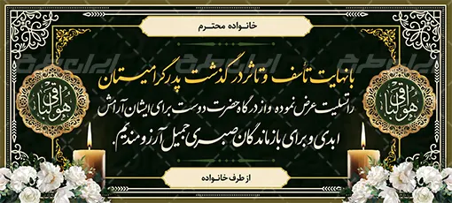 طرح بنر تسلیت ، توسط تیم حرفه ای ایران طرح جهت استفاده کاربران سایت طراحی و به صورت لایه باز در دسترس کاربران قرار گرفته است.