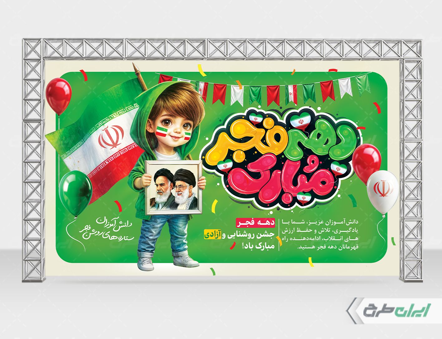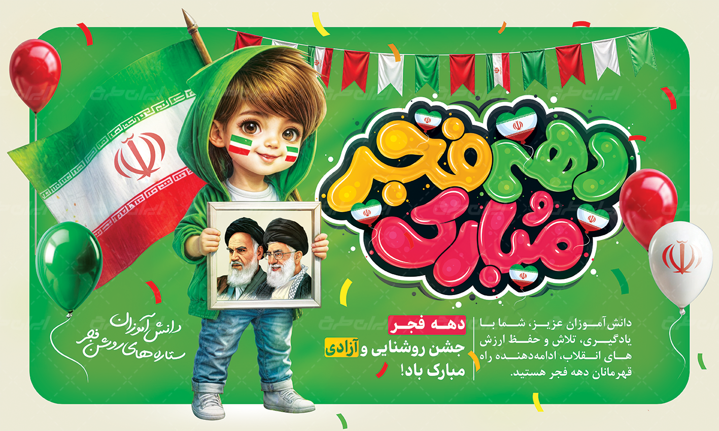 تصویر کودک، تایپوگرافی دهه فجر مبارک و متن گرامیداشت دهه فجر می باشد که توسط تیم ایران طرح طراحی شده است.