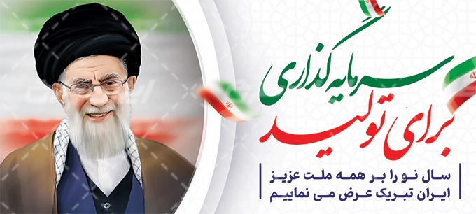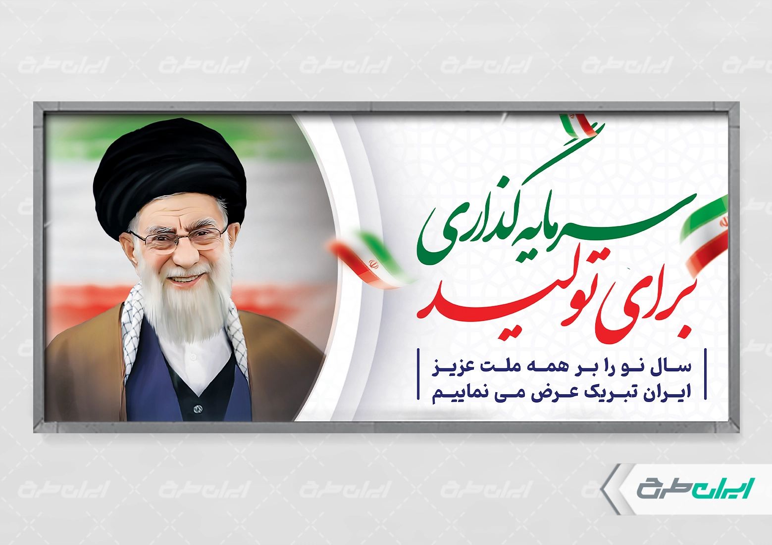 تصویر رهبری و متن شعار سال سرمایه گذاری برای تولید، که توسط تیم ایران طرح طراحی شده است.