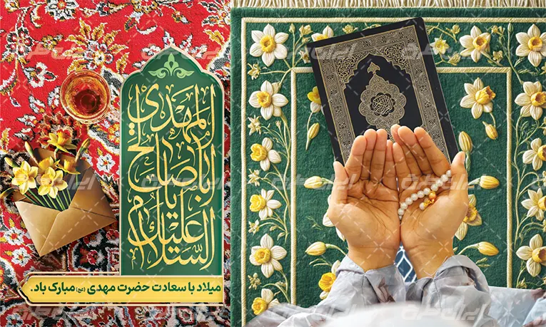 تصویر قرآن و گل نرگس و متن تبریک ولادت امام مهدی می باشد که توسط تیم ایران طرح طراحی شده است.