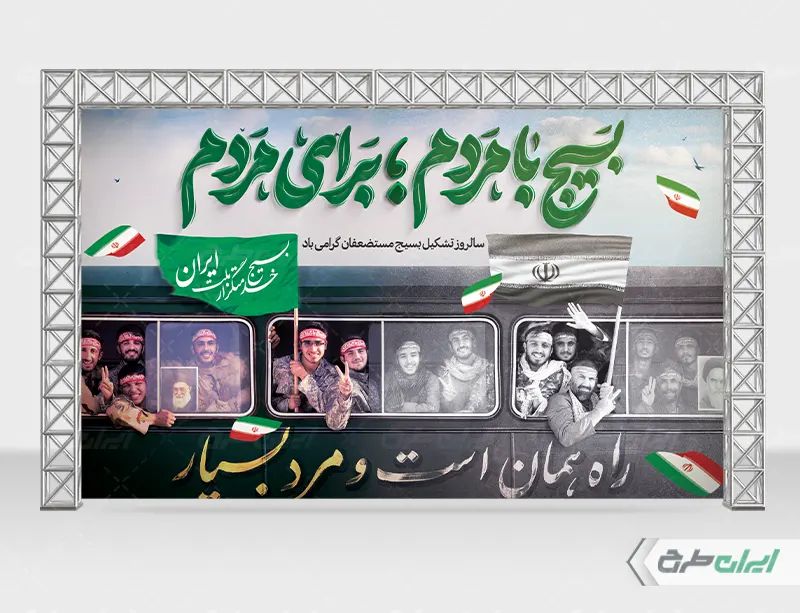 بنر لایه باز تبریک هفته بسیج، توسط تیم حرفه ای ایران طرح جهت استفاده کاربران سایت طراحی و به صورت لایه باز در دسترس کاربران قرار گرفته است.