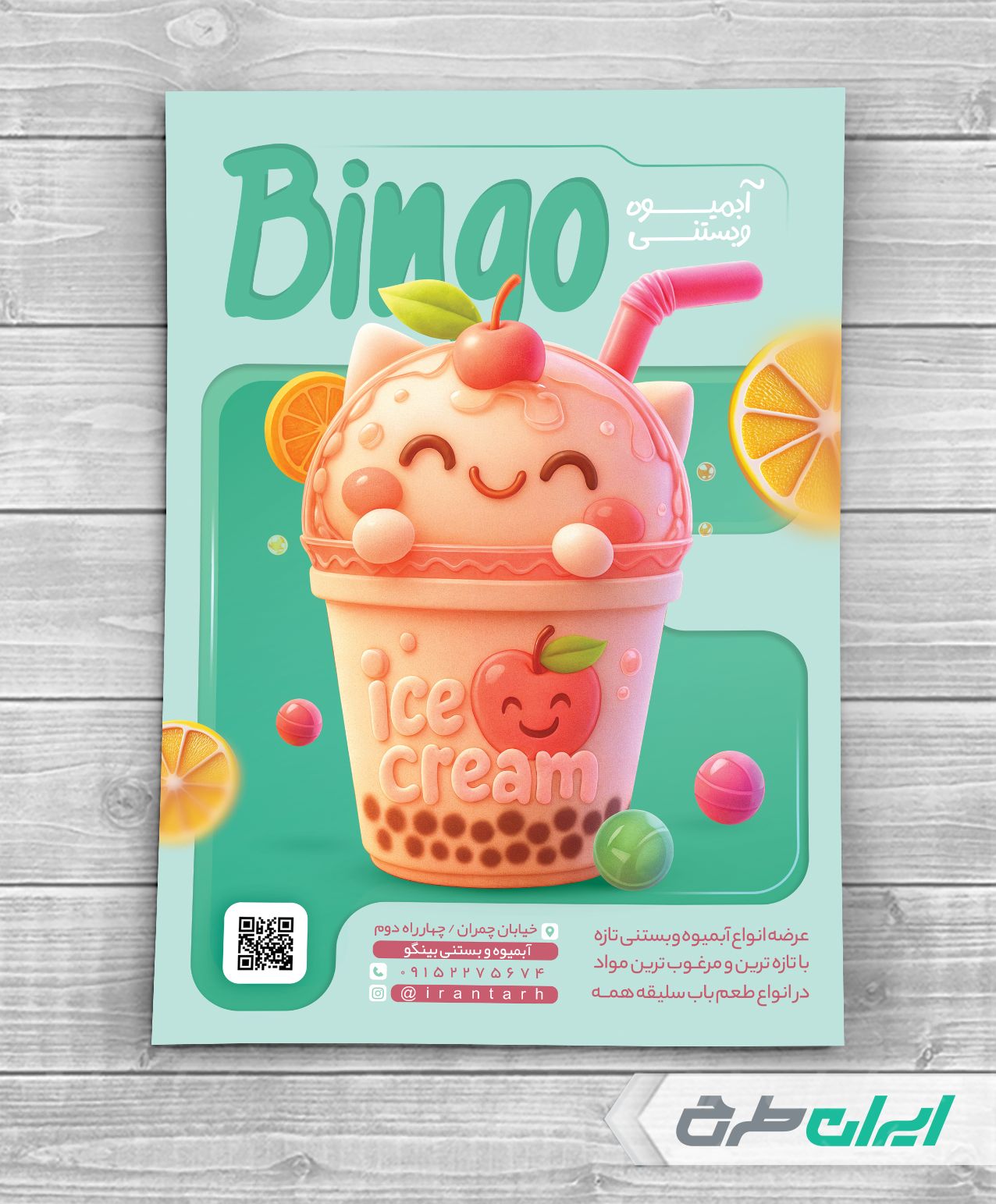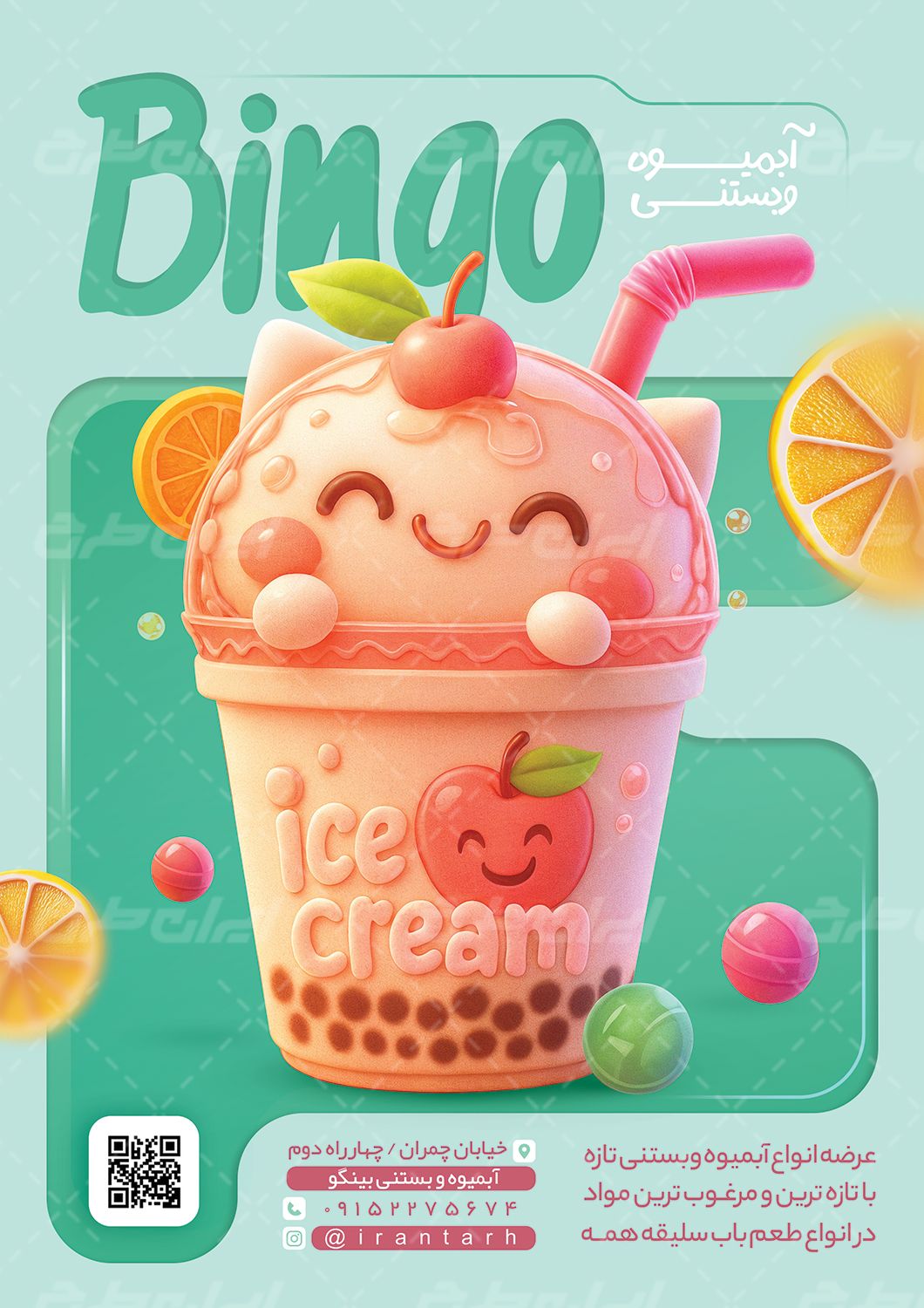 - استفاده از عکس با کیفیت بستنی که مناسب با طرح تراکت لایه باز آبمیوه سرا می باشد.