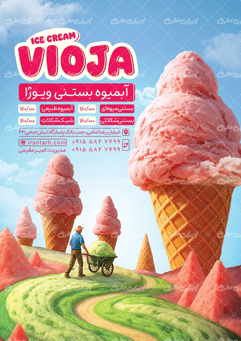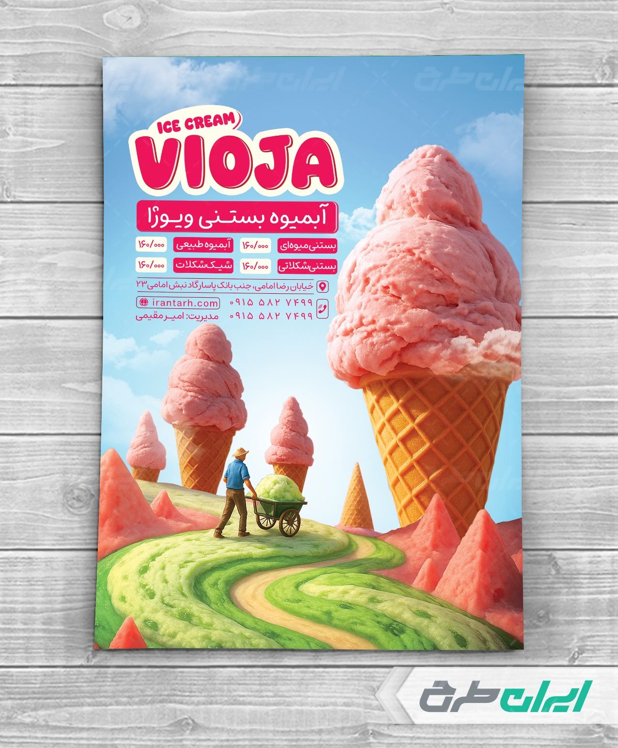- استفاده از عکس با کیفیت بستنی که مناسب با طرح تراکت لایه باز آبمیوه سرا می باشد.