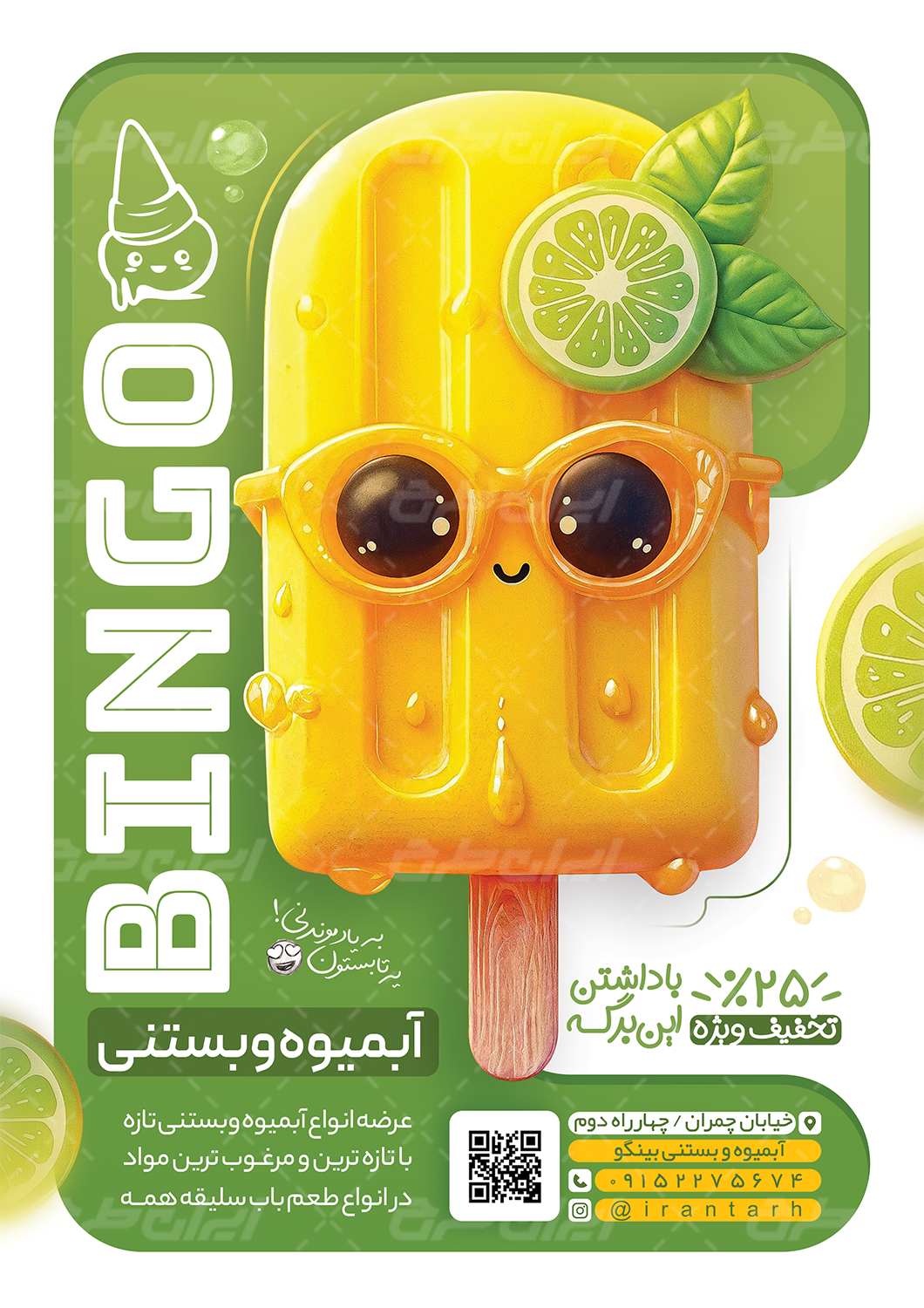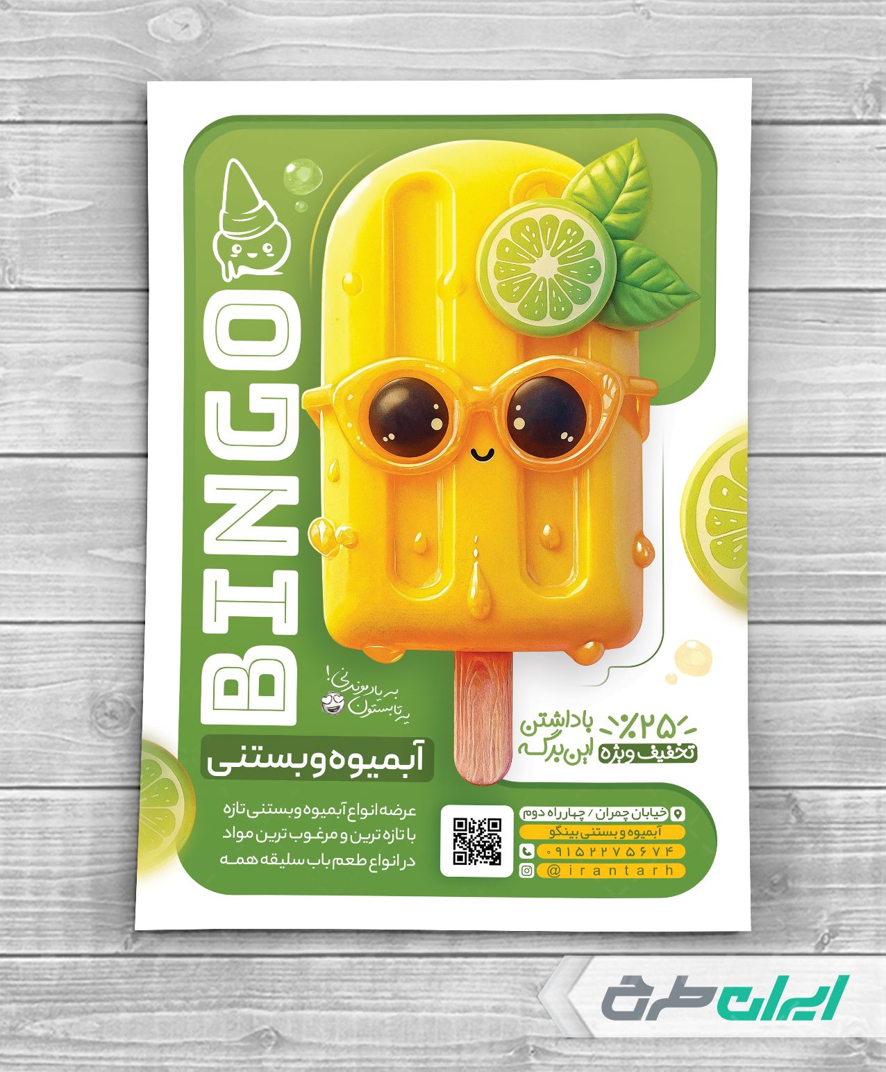 - استفاده از عکس با کیفیت بستنی که مناسب با طرح تراکت لایه باز آبمیوه سرا می باشد.