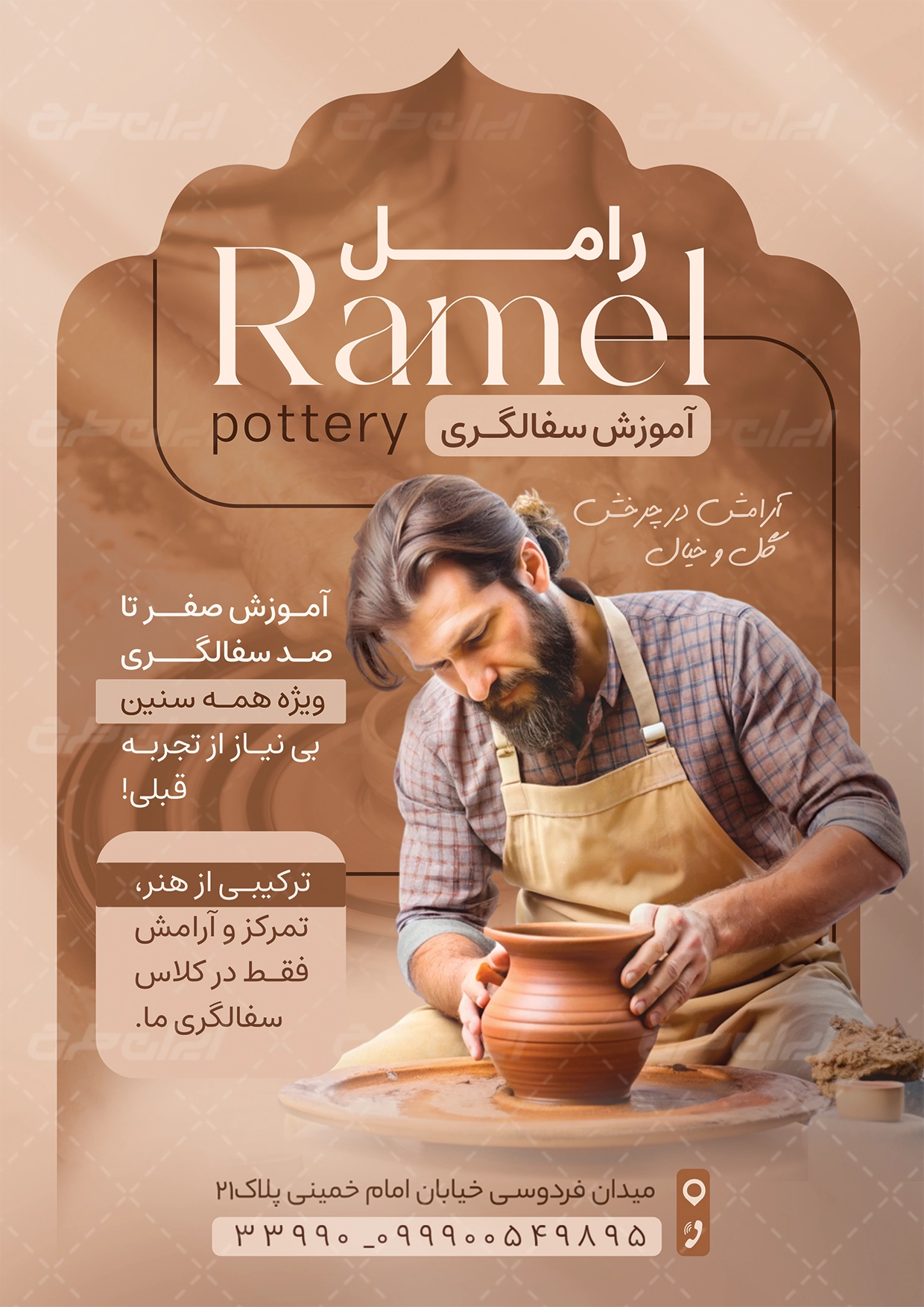 طرح تراکت آموزشگاه سفالگری، جهت بازاریابی و تبلیغات این دسته از مشاغل توسط تیم طراحان ایران طرح طراحی و در دسترس کاربران سایت قرار گرفته است.