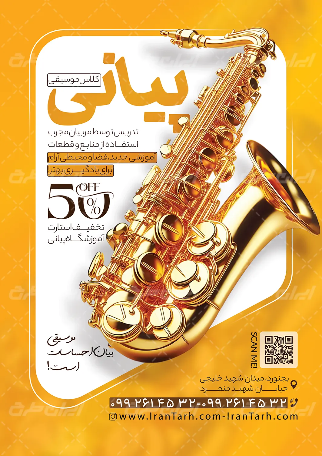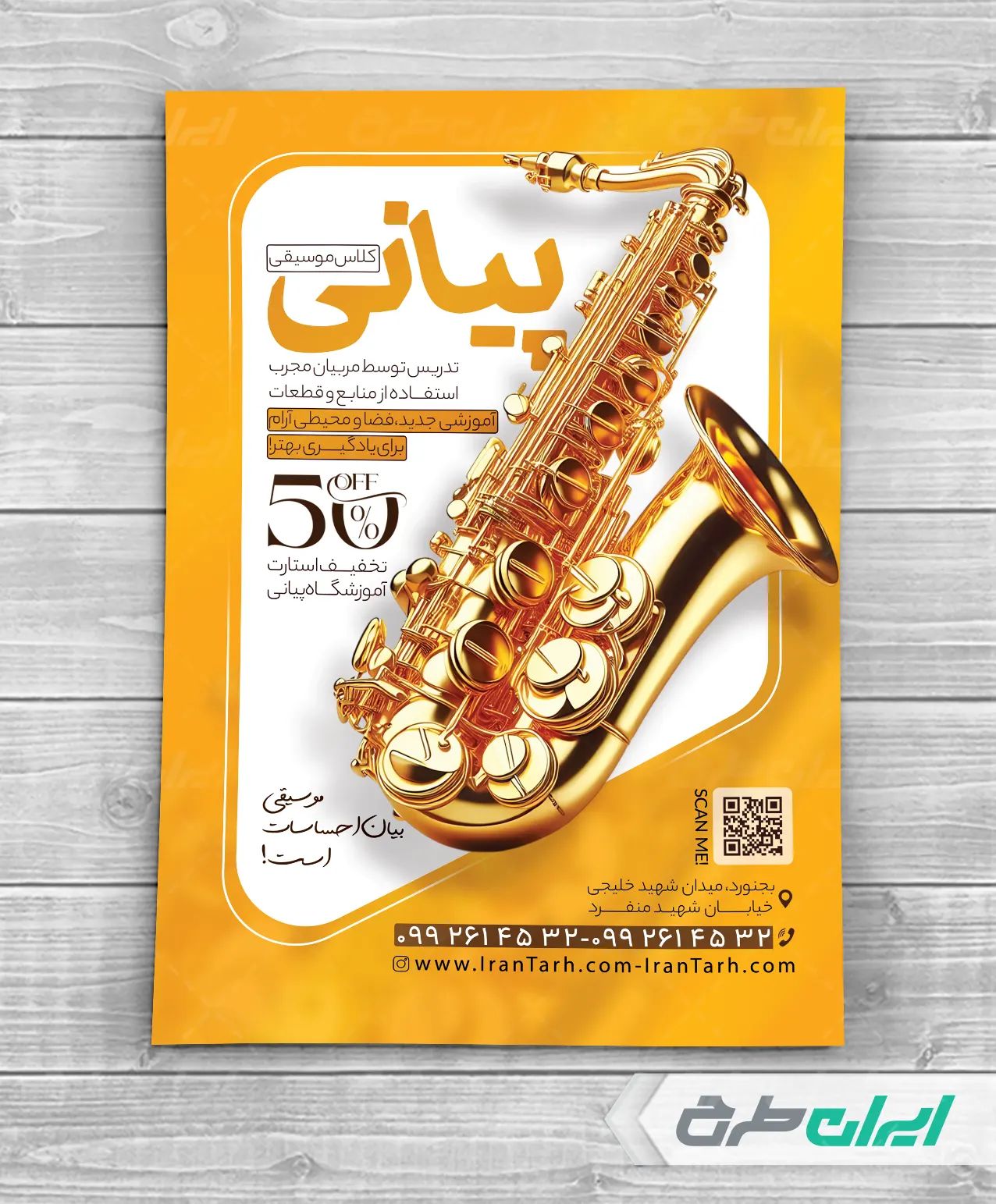 - استفاده مناسب از عکس باکیفیت ابزار آلات موسیقی در طرح تراکت آموزشگاه موسیقی