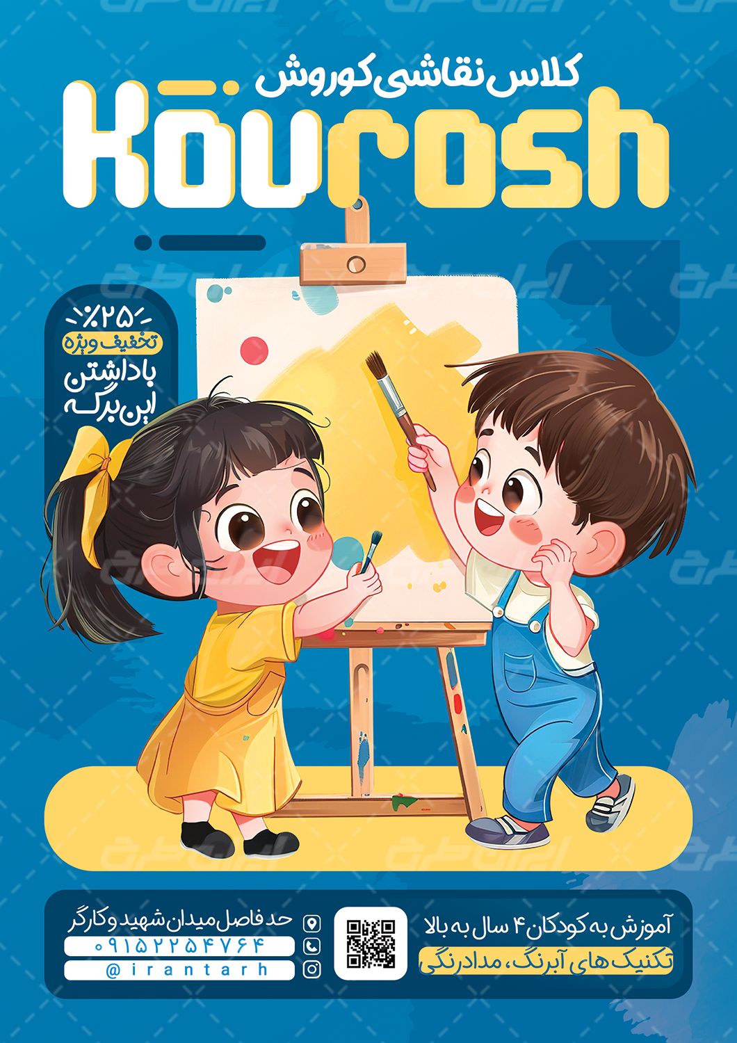 - استفاده از عکس با کیفیت و تصویر پسربچه در طرح تراکت آموزشگاه نقاشی می باشد.