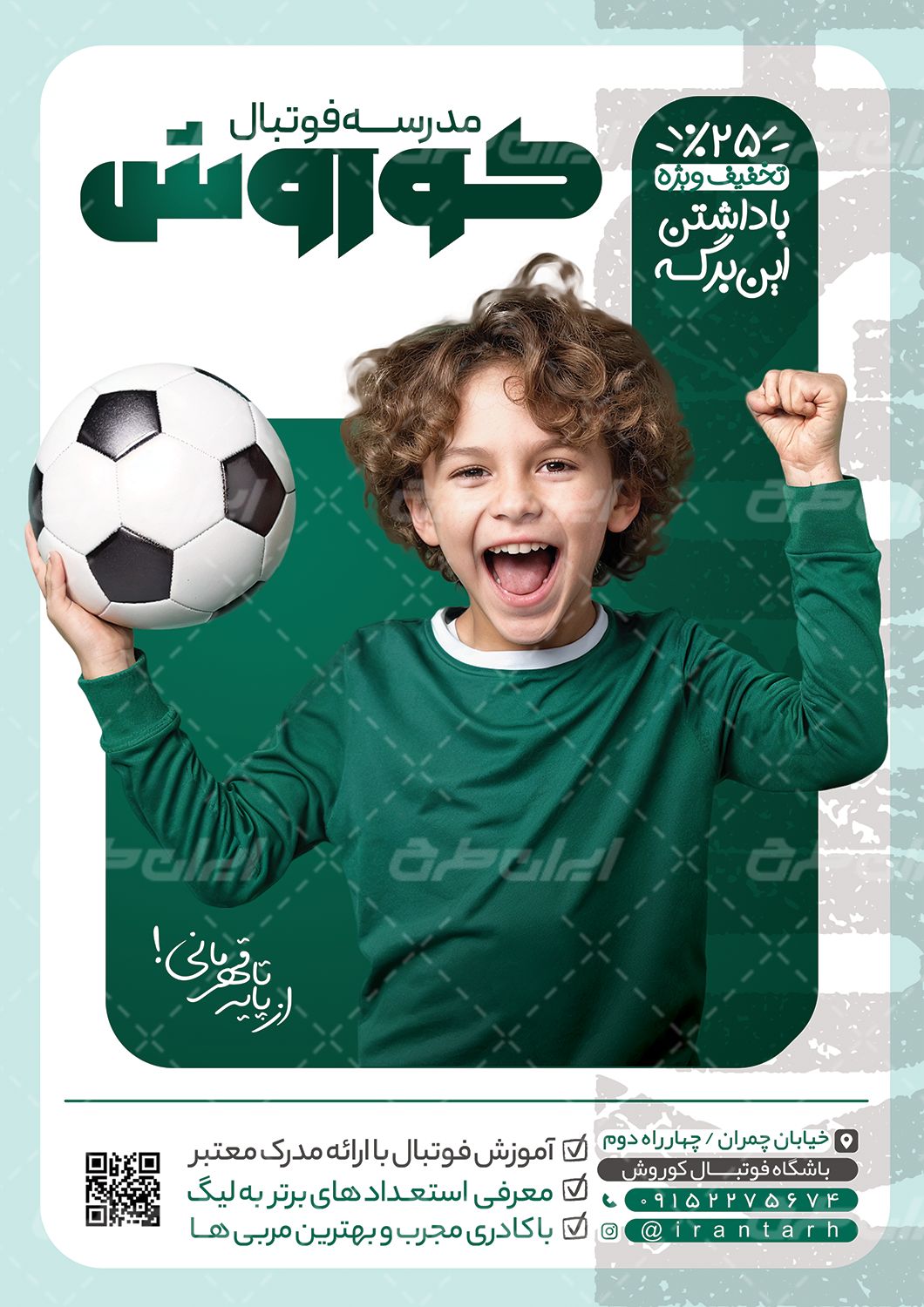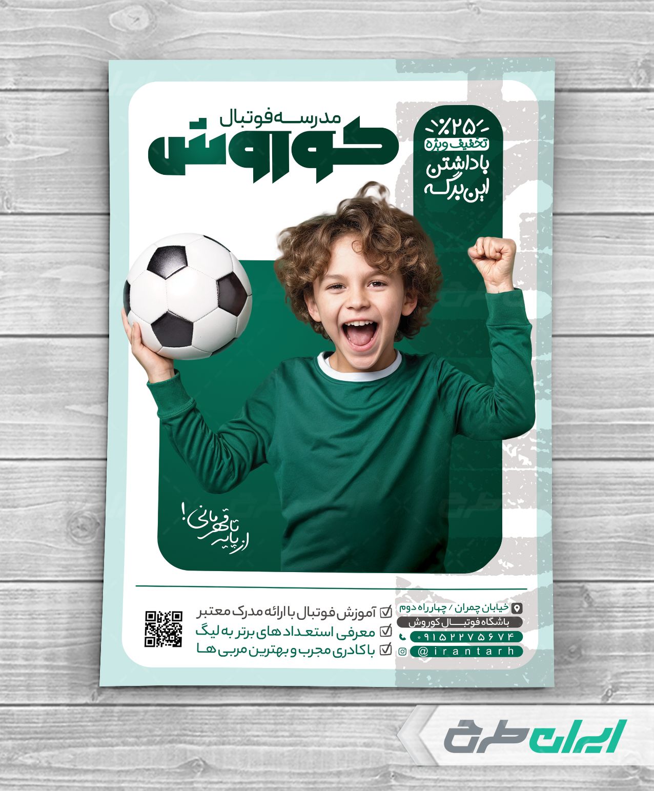 طرح تراکت لایه باز مدرسه فوتبال، جهت بازاریابی و تبلیغات این کلاس ها توسط ایران طرح طراحی و در اختیار کاربران سایت قرار گرفته است.