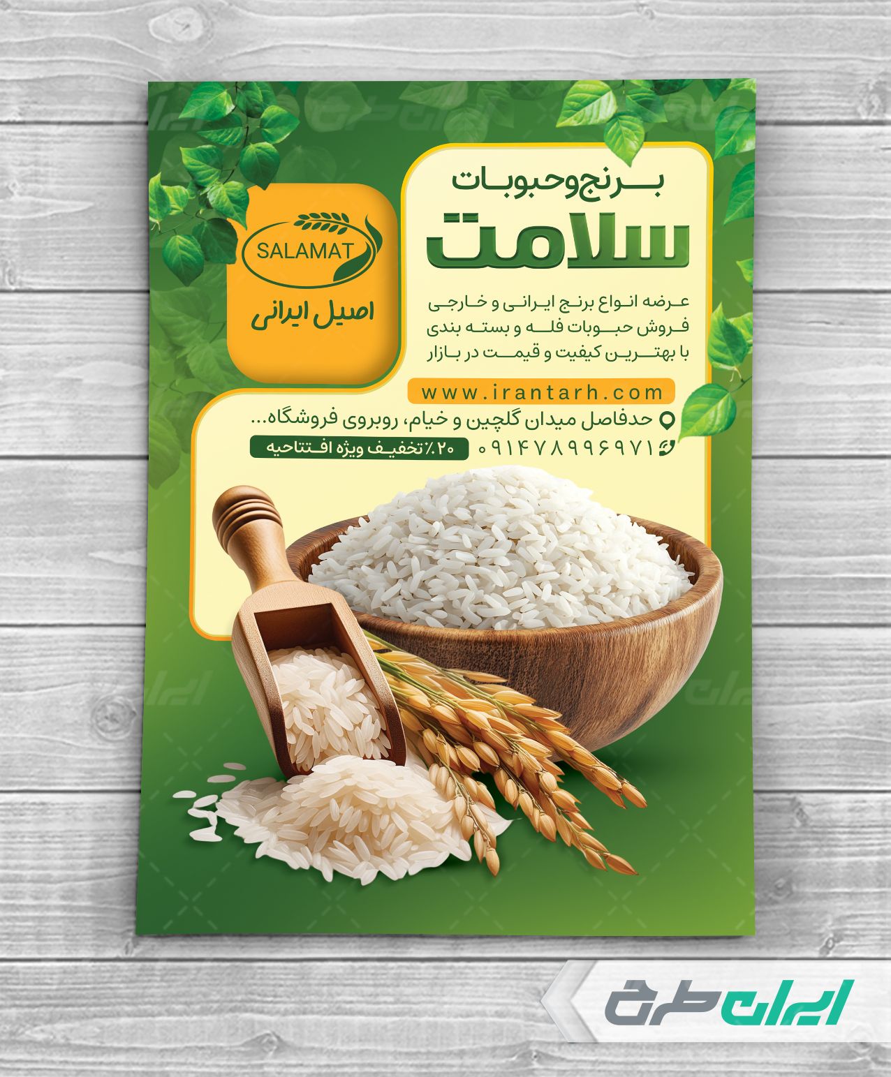 تراکت لایه باز فروشگاه برنج و حبوبات، توسط تیم ایران طرح برای بازاریابی و تبلیغات این فروشگاه طراحی شده است.