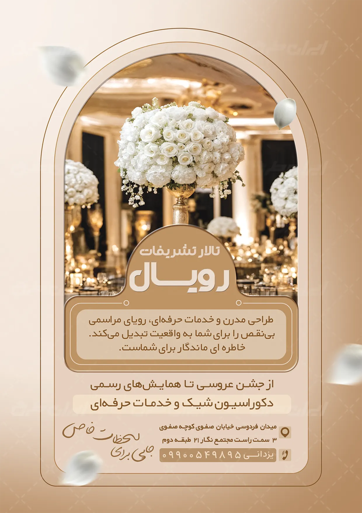 - استفاده مناسب از عکس باکیفیت تزئینات تالار پذیرایی در طرح تراکت تالار پذیرایی