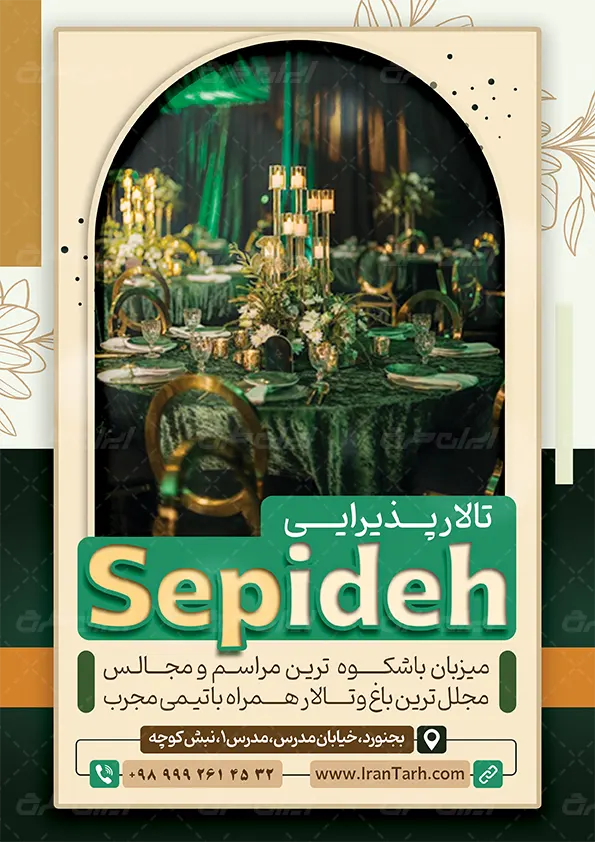 - استفاده مناسب از عکس باکیفیت تزئینات تالار پذیرایی در طرح تراکت تالار پذیرایی