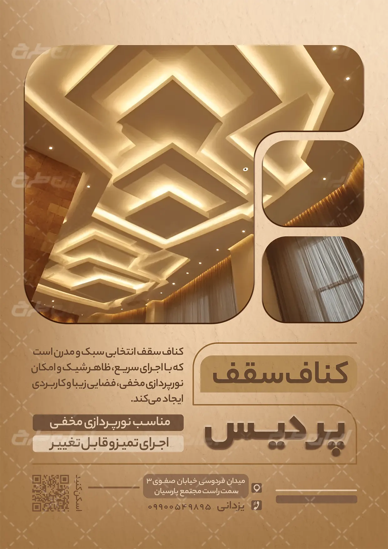 طرح تراکت لایه باز خدمات کناف سقفی، جهت بازاریابی و تبلیغات این درسته از مشاغل طراحی و در اختیار کاربران سایت قرار گرفته است.