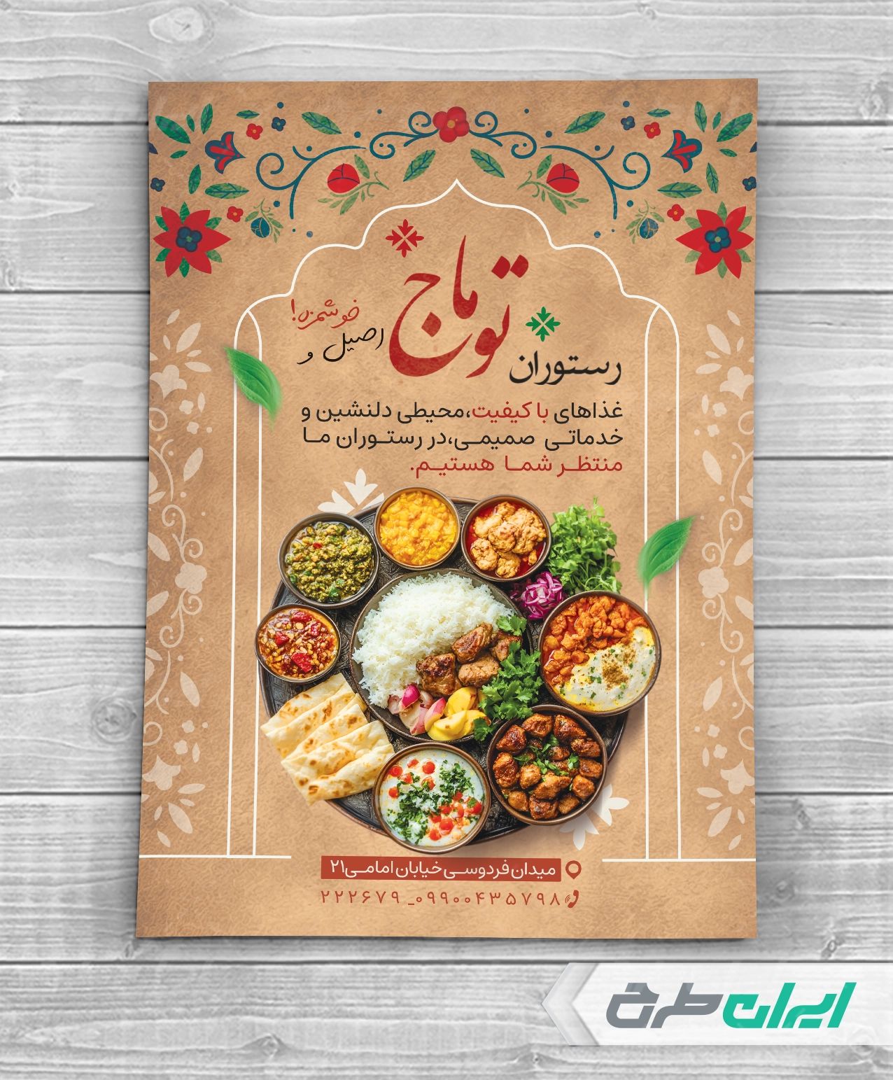 طرح تراکت لایه باز رستوران، توسط تیم ایران طرح برای بازاریابی و تبلیغات این دسته از مشاغل طراحی شده است.