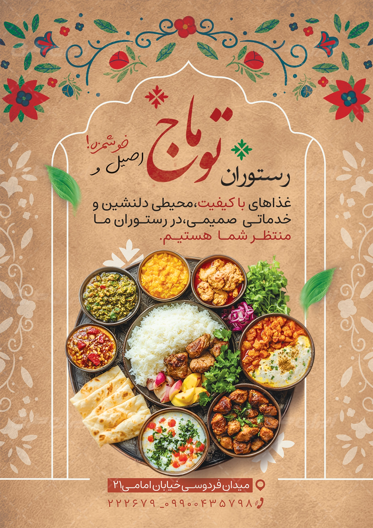 - استفاده از عکس باکیفیت غذای ایرانی که مناسب طرح تراکت رستوران می باشد.